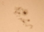 やっと撮れた!ここ数日、あちらこちらから巨大黒点のニュースが入り、数値的には昨年9月の黒点を遥かに凌ぐ黒点に成長したとあってもこの目で見れないと意味が無い。しかしデカイ。朝の出勤前に撮ったのでシーイングも何もあったものでは無いので決して良い写真では無いが、記念の一枚には違い無い。