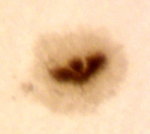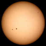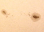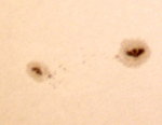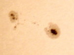 | 左から回ってきた黒点、なかなかのサイズですね。でも、巨大黒点とは言い難い?早く目も覚めるような超巨大黒点にお目にかかりたい。 | ||
