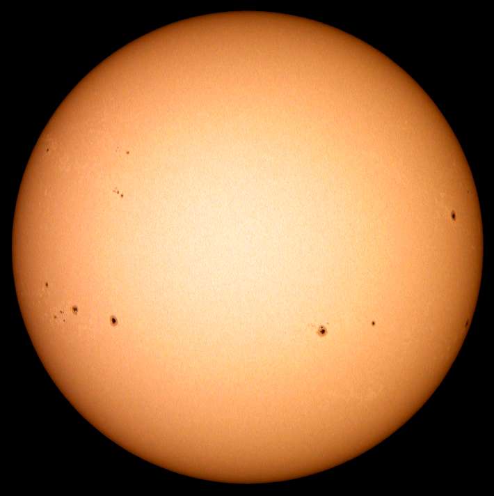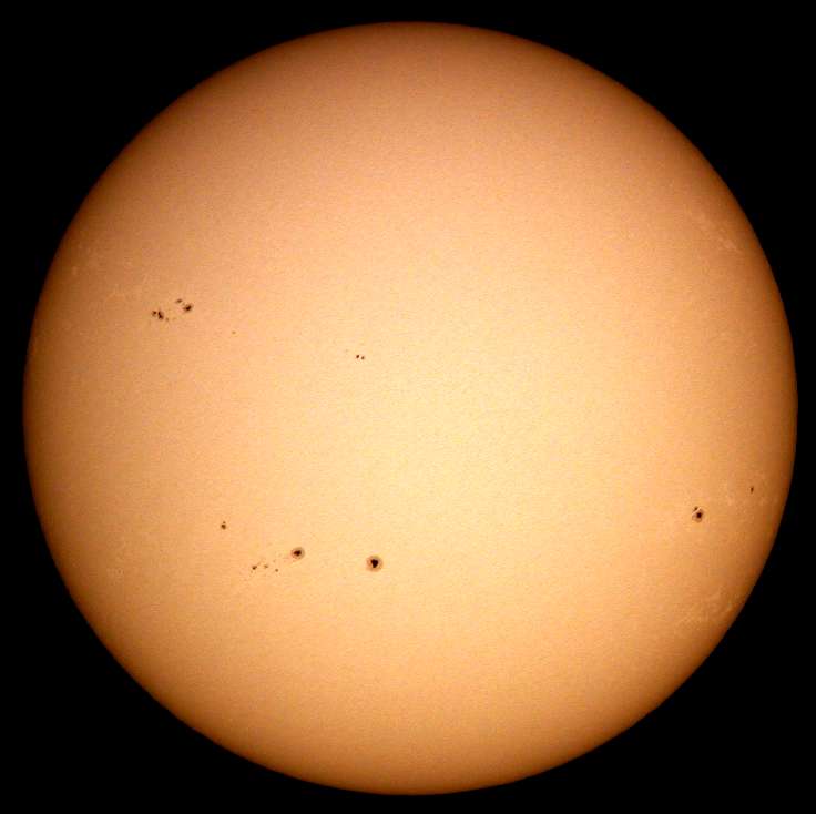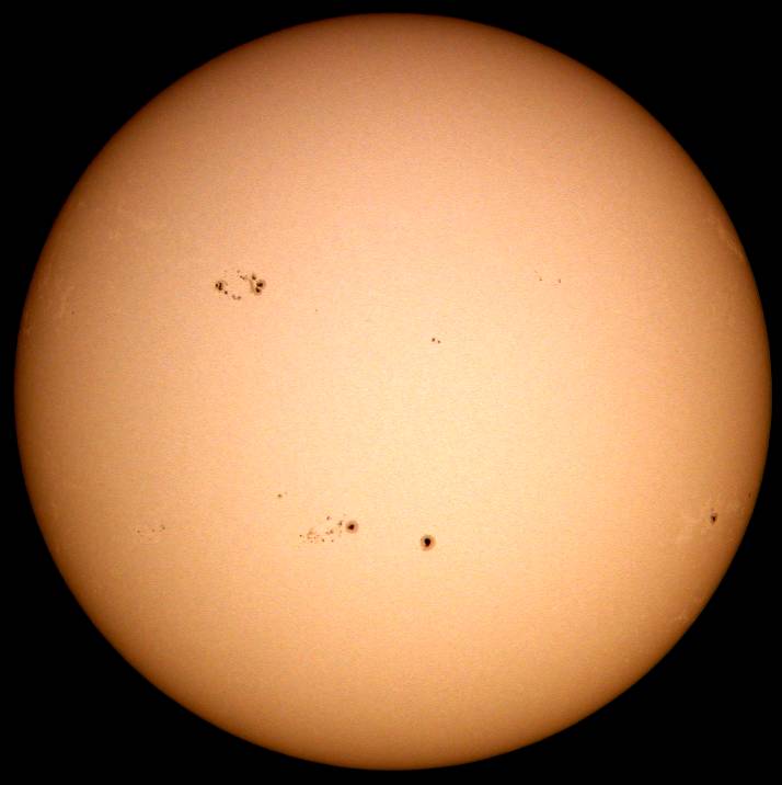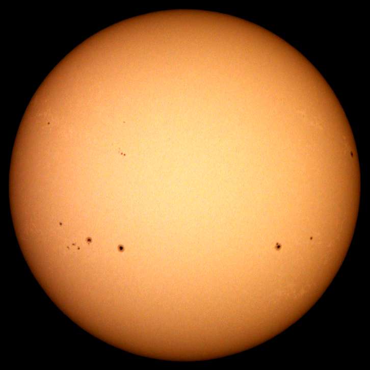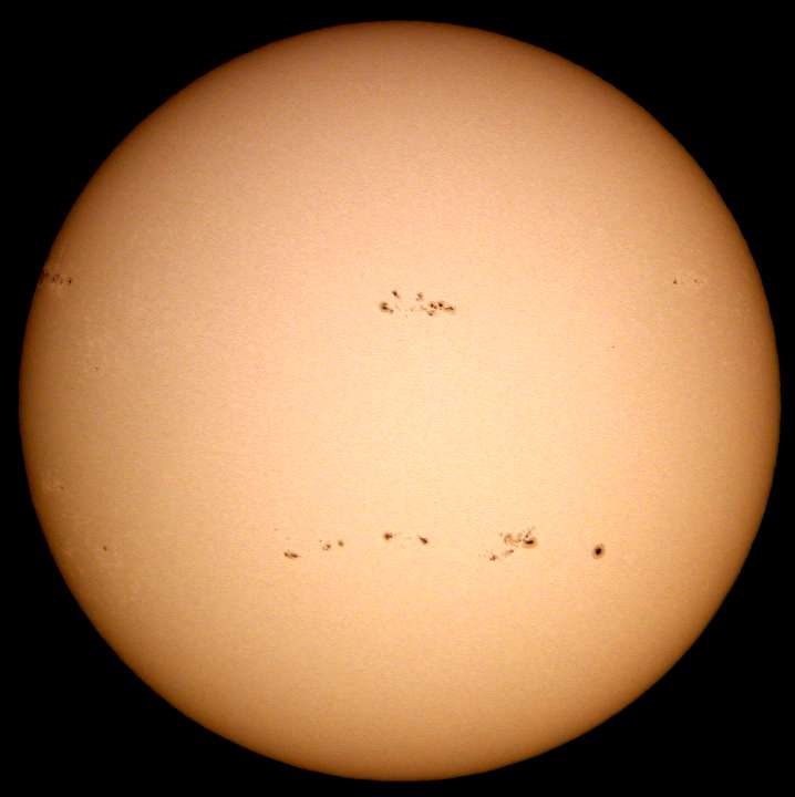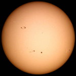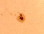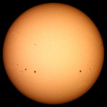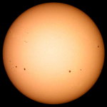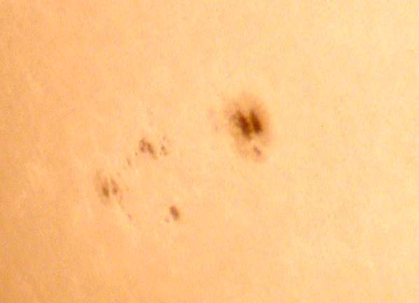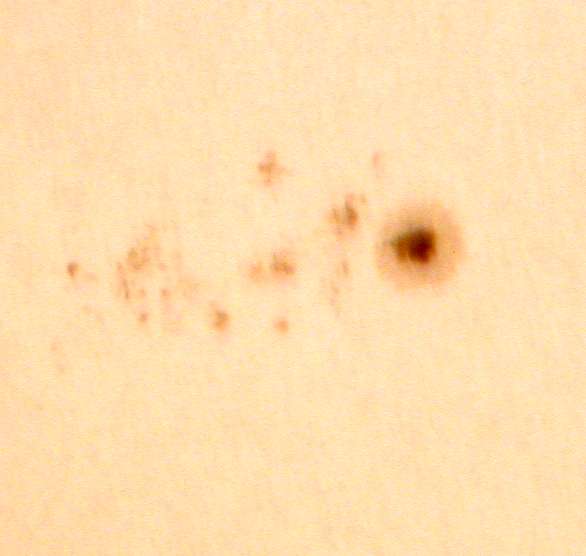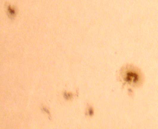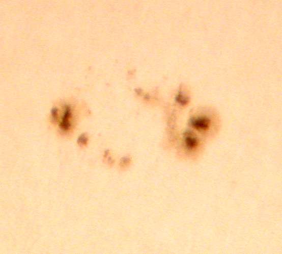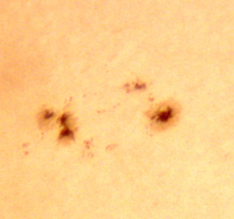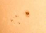 | デジカメ太陽シリーズ 巨大黒点を追え36 午前中台風の余波で、雲が多かったのですが、午後から晴れたので撮影です。なんと!黒点が並んでいる。おもしろいですね。 |