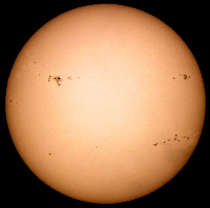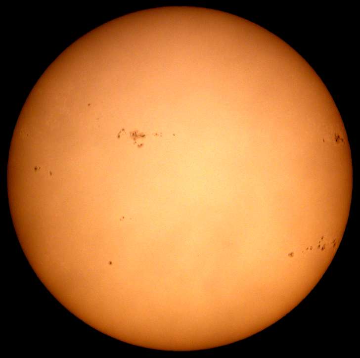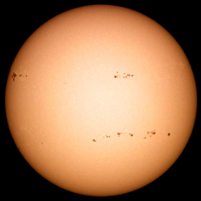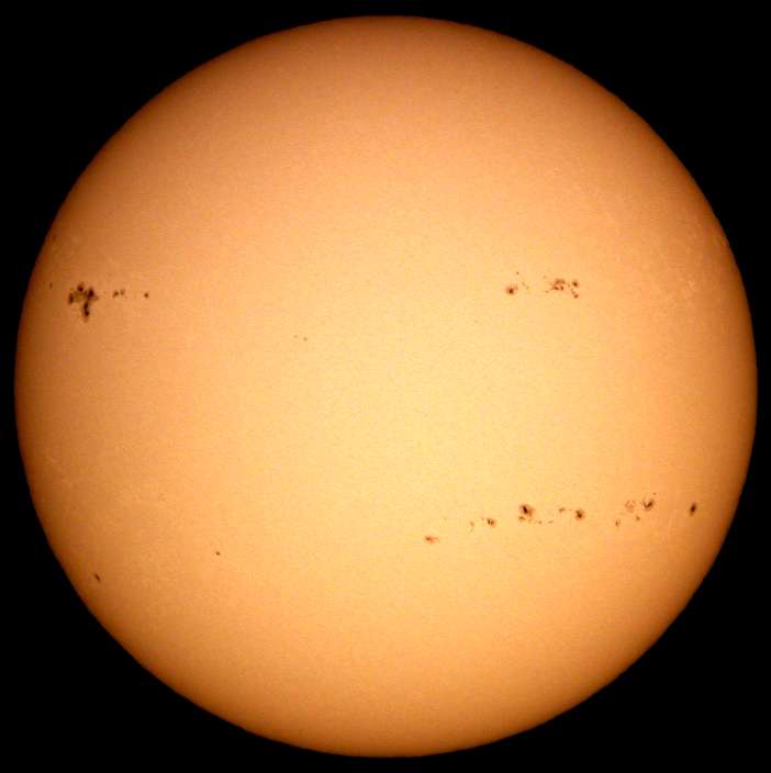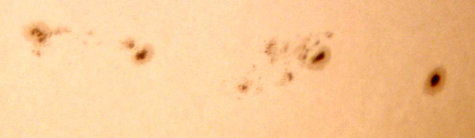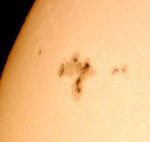 | デジカメ太陽シリーズ 巨大黒点を追え41 やっと晴れた。全景写真・拡大・強拡大。あれ、巨大黒点群が無い?いやいや、どうも元気が無いようだ。このまま消滅かな?くそー!撮り損ねた! |