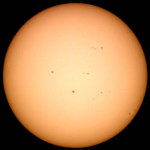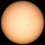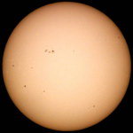 | デジカメ太陽シリーズ 巨大黒点を追え60 午前中、台風の影響で雲だらけ。夕方に晴れてきたので撮影です。ちょっとお遊びで、XP24mmで撮影しました。接眼部が小さいのでケラレが大きいですね。シーイングの悪さも手伝って最低の写真でした。 |