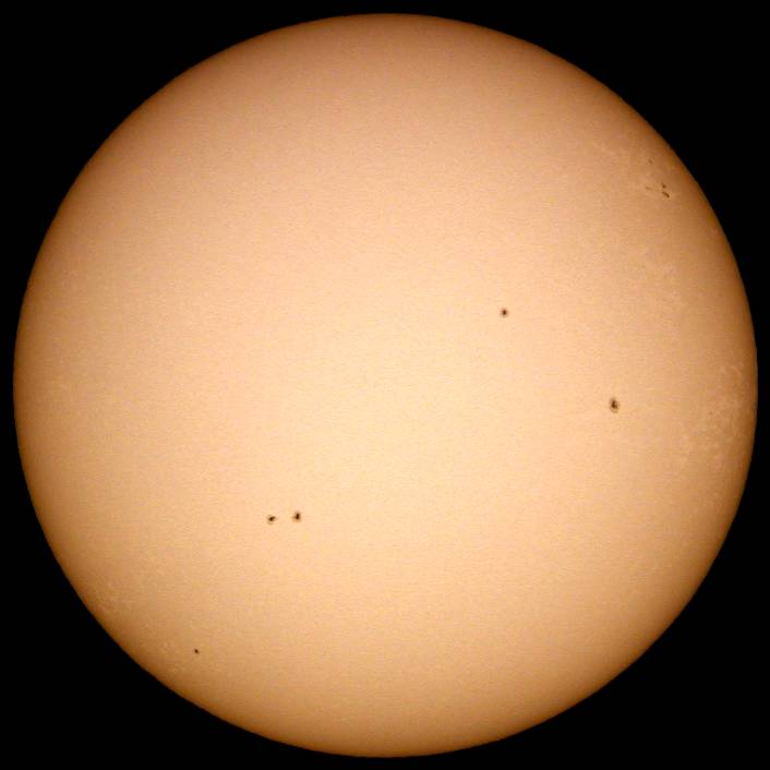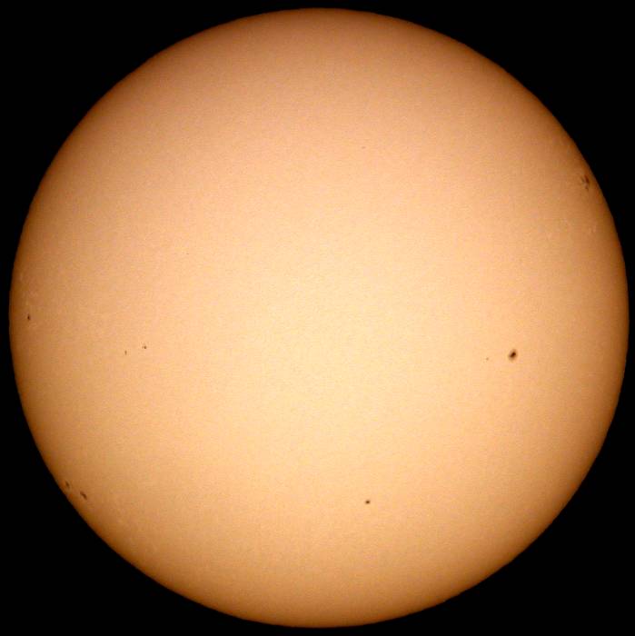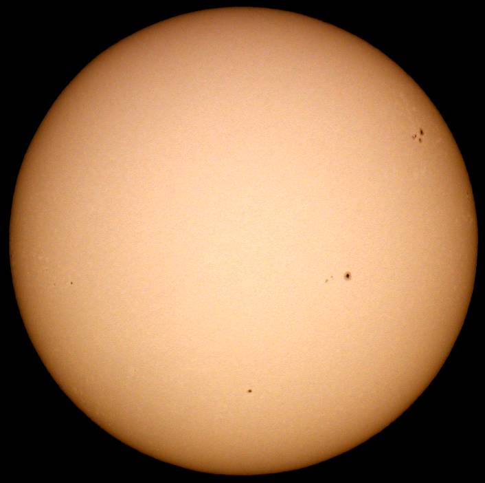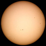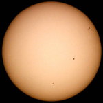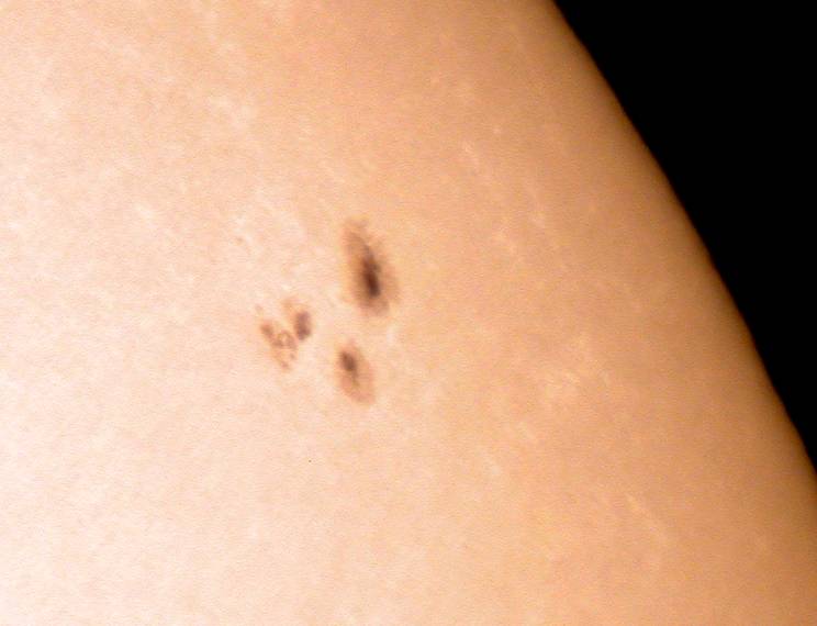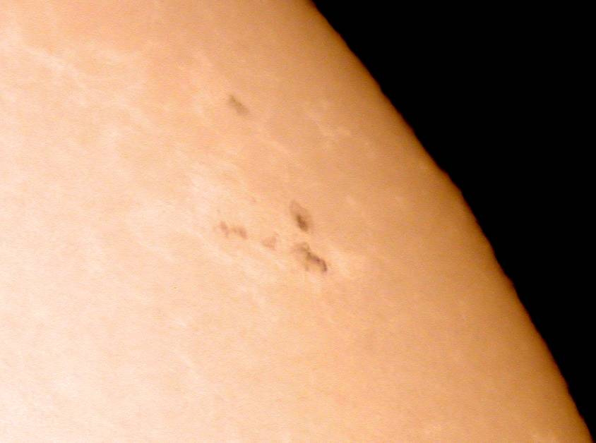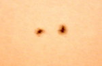黒点消滅は免れた。左から、黒点が回ってきた。よかった。ここ数日、太陽のエッジの黒点撮影のテストをして気付いたが、シャッター速度が思ったほど出ていないようだ。絞り優先で撮影していたが、バックの空の分暗いと判断し、シャッター速度を落としているようだ。スポット測光に切り替えてもよいが、いっそのこと、マニュアル撮影で絞りもシャッター決めたほうが良さそうかな? |