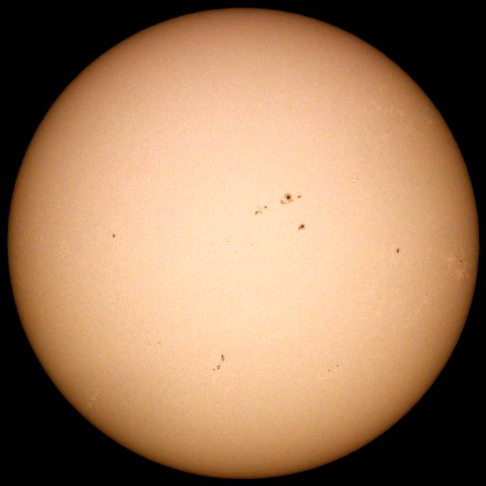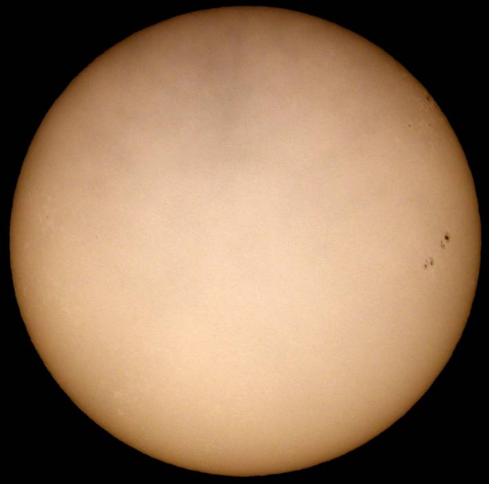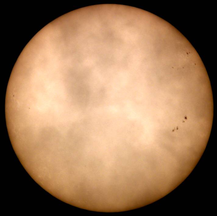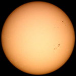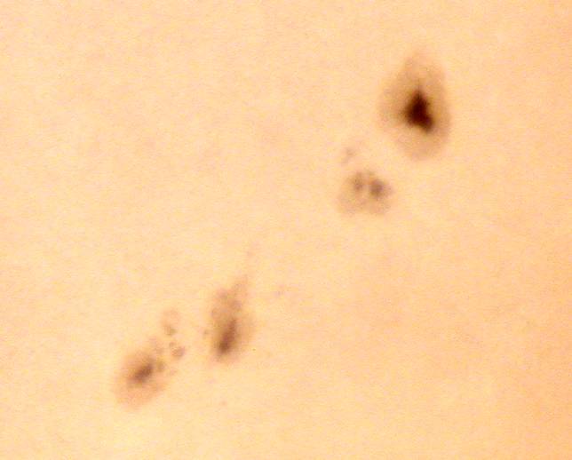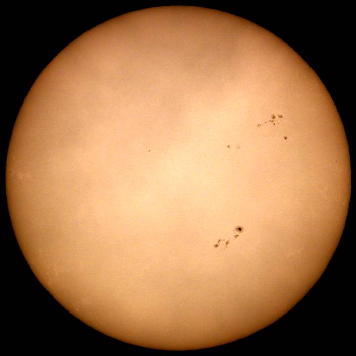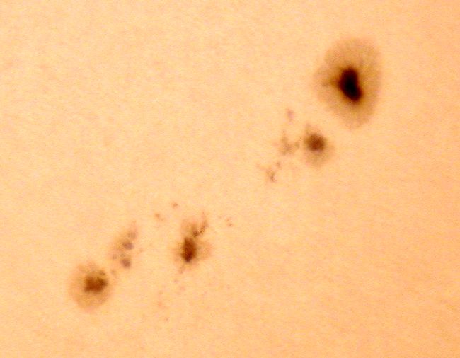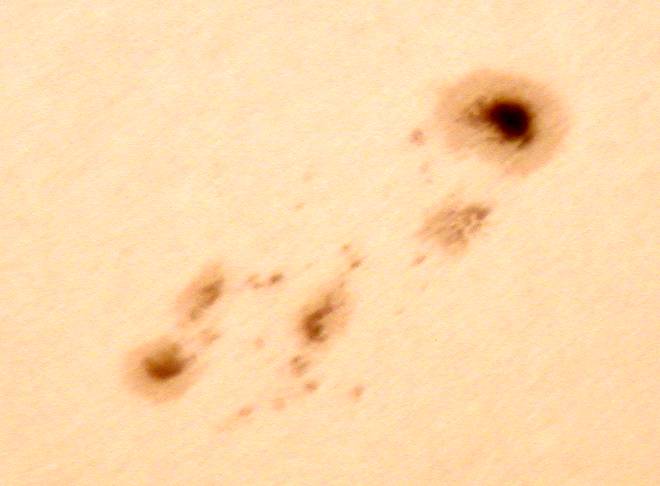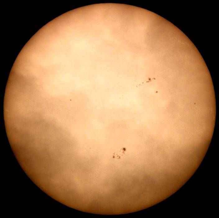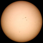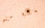| デジカメ太陽シリーズ 巨大黒点を追え76 またまた、うす曇り。おまけに、拡大撮影するには、余りにも条件が厳しい。全景写真のみパシャリ。もうすぐ群が裏に回る。次の黒点は回ってこない。いよいよ、黒点消滅か?太陽グラフは右上がりなのだが!? |