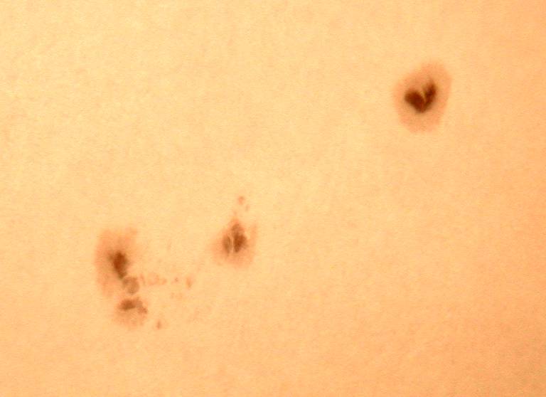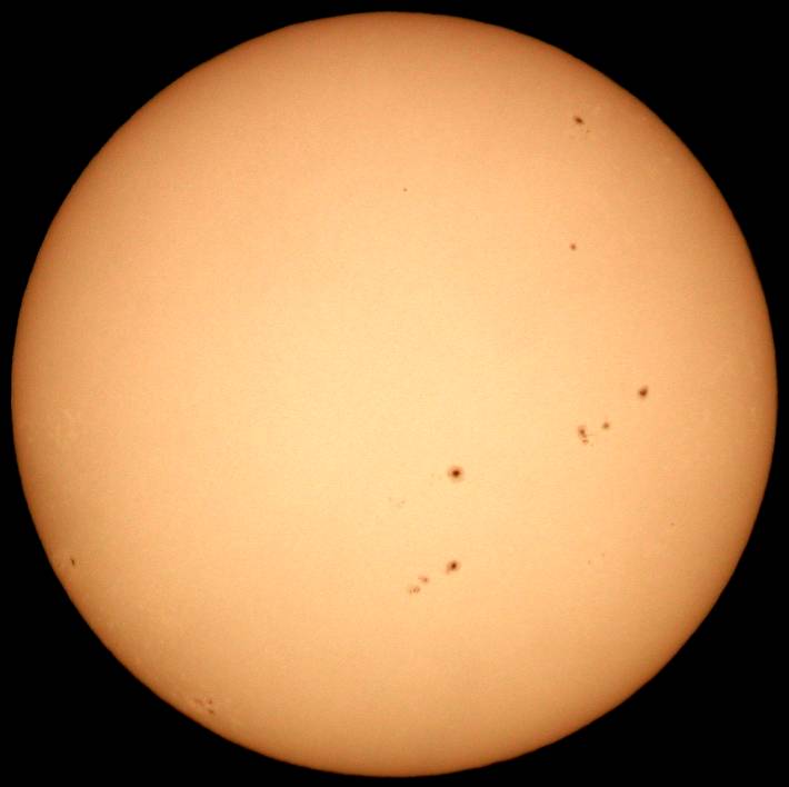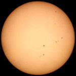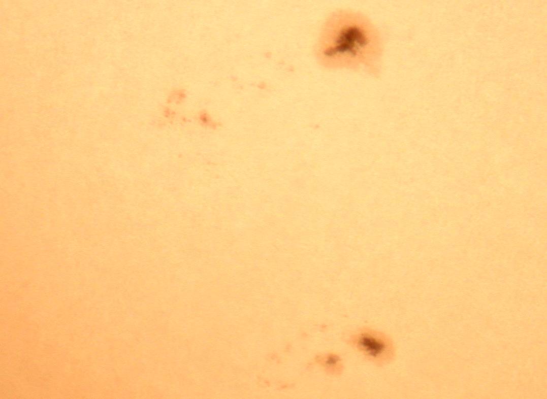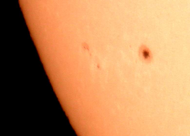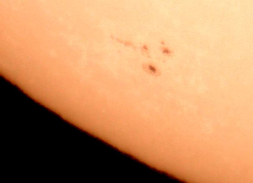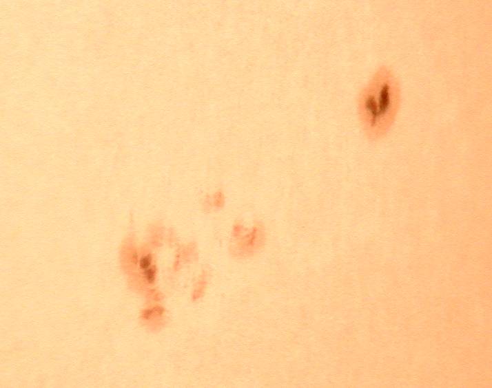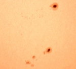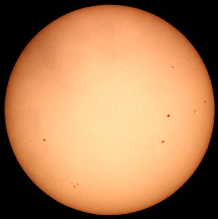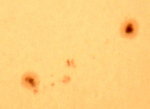 | デジカメ太陽シリーズ 巨大黒点を追え94 天気は下り坂。昼まで持ったので撮影ですが、うす雲があり、広域写真のみになりました。拡大撮影も行いましたが、シーイングが悪い事と、うす雲で高速シャッターが切れなかった事と重なり、失敗でした。 |