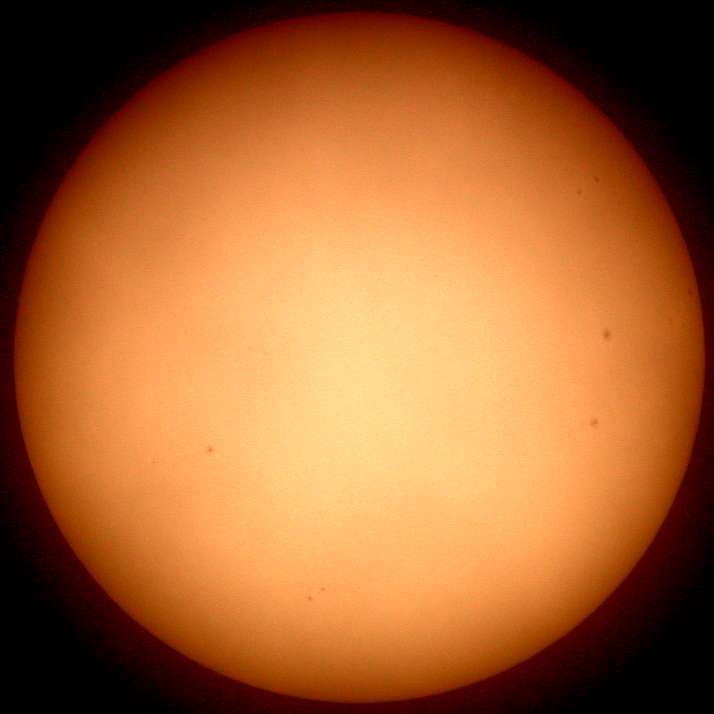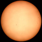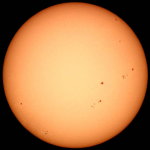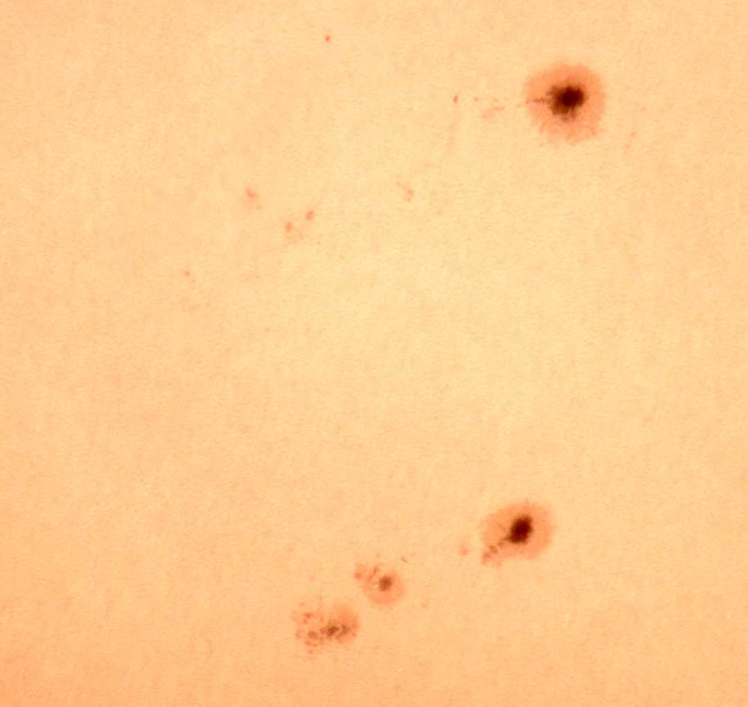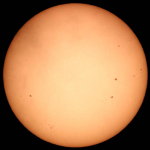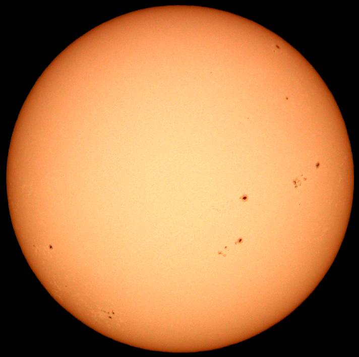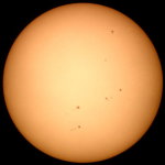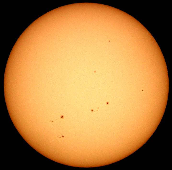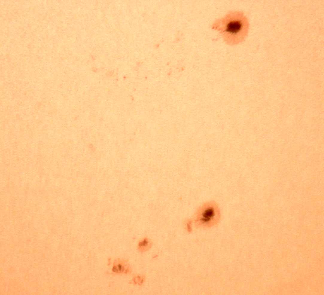 | デジカメ太陽シリーズ 巨大黒点を追え94 天気は下り坂。昼まで持ったので撮影ですが、うす雲があり、広域写真のみになりました。拡大撮影も行いましたが、シーイングが悪い事と、うす雲で高速シャッターが切れなかった事と重なり、失敗でした。 |