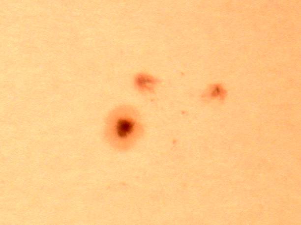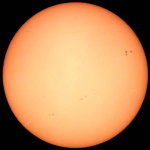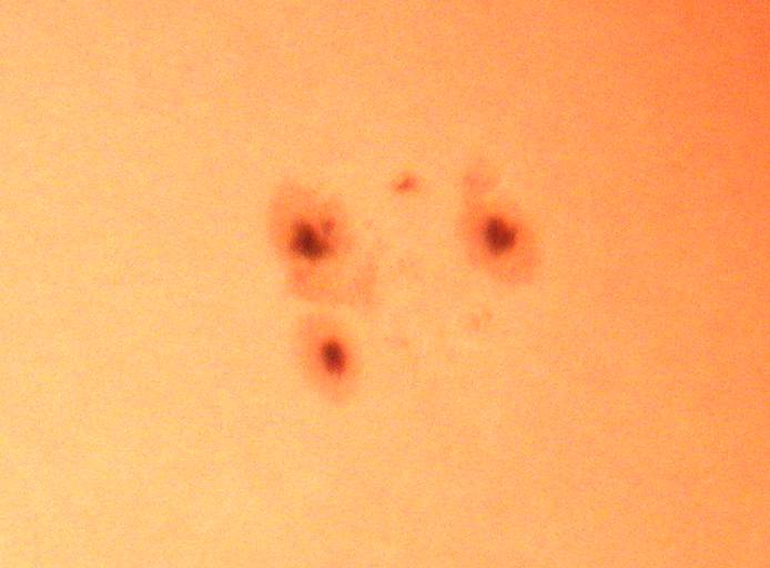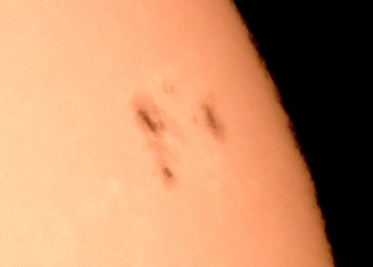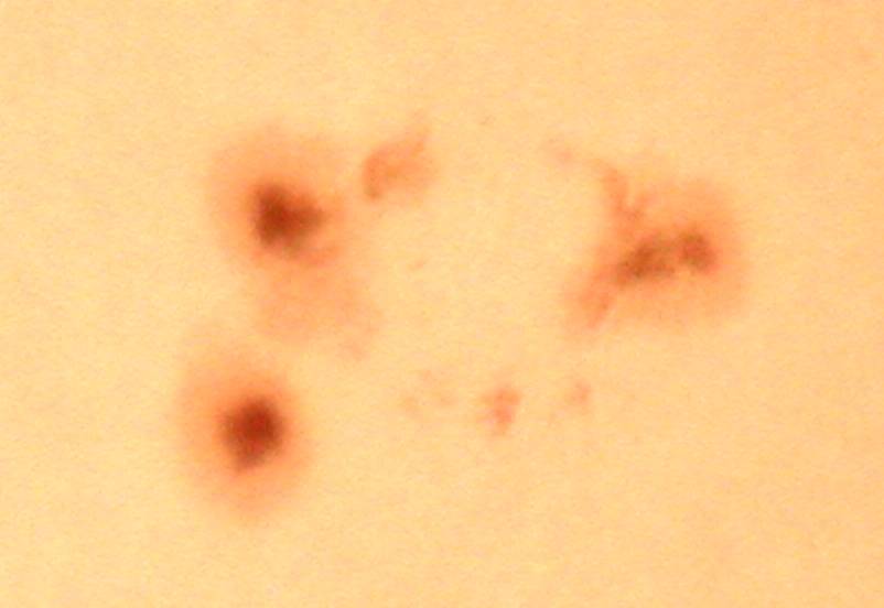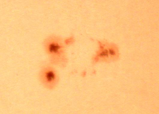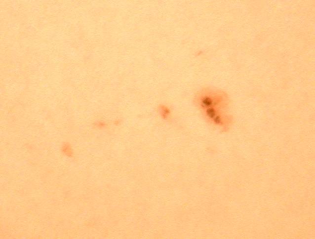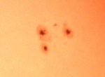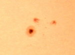 | デジカメ太陽シリーズ 巨大黒点を追え102 何とか雲間から撮影。西没する黒点の変化が、少なくなった?これで終わりかな?東出までもたないでしょう。残念だ。 |