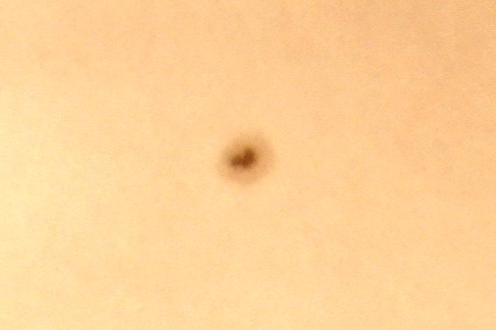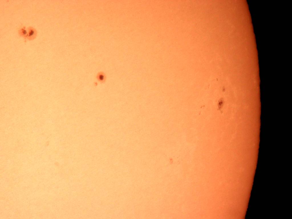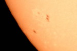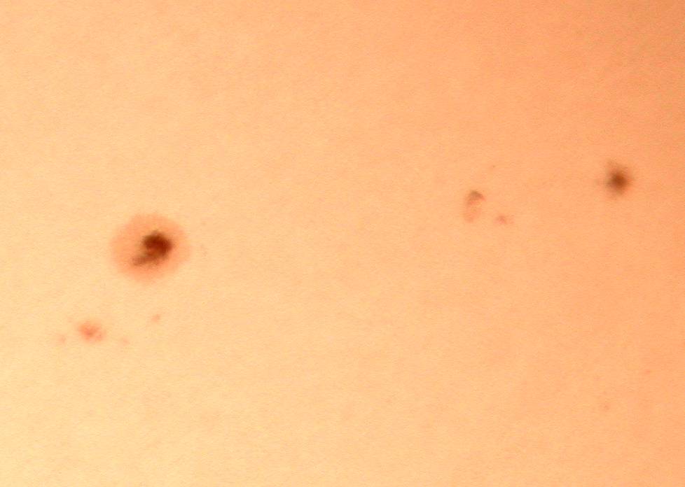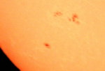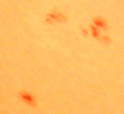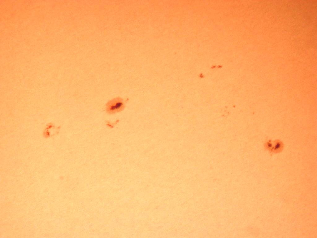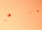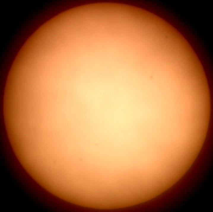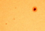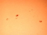 | デジカメ太陽シリーズ 巨大黒点を追え119 ウンザリするような天気です。うす雲を通して光球が確認出来たので、広域のみ撮影したのですが、辛うじて群が確認出来るか出来ないかの写りでした。 |