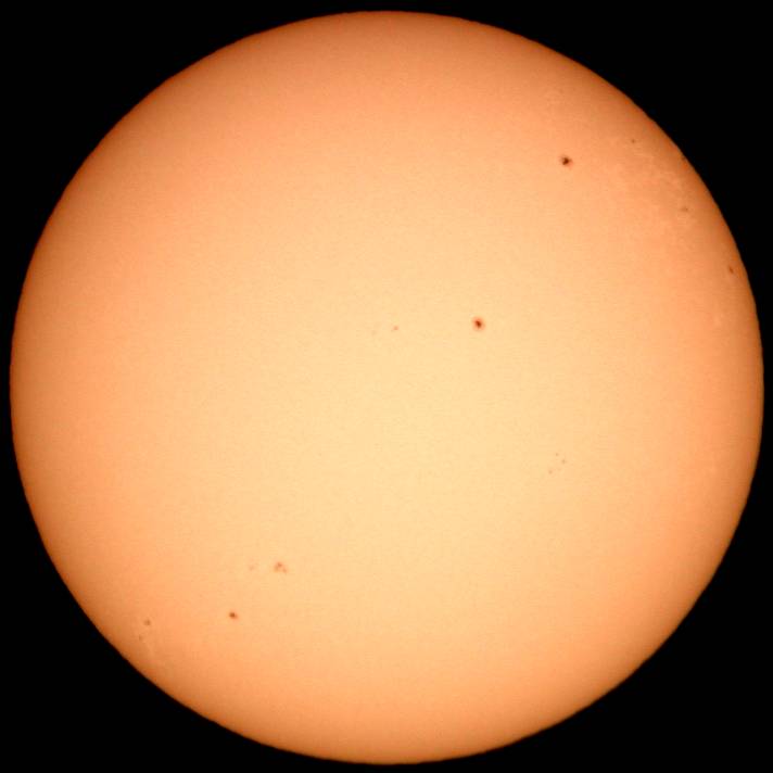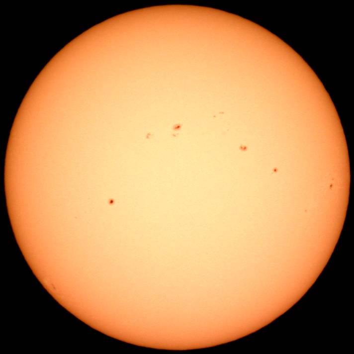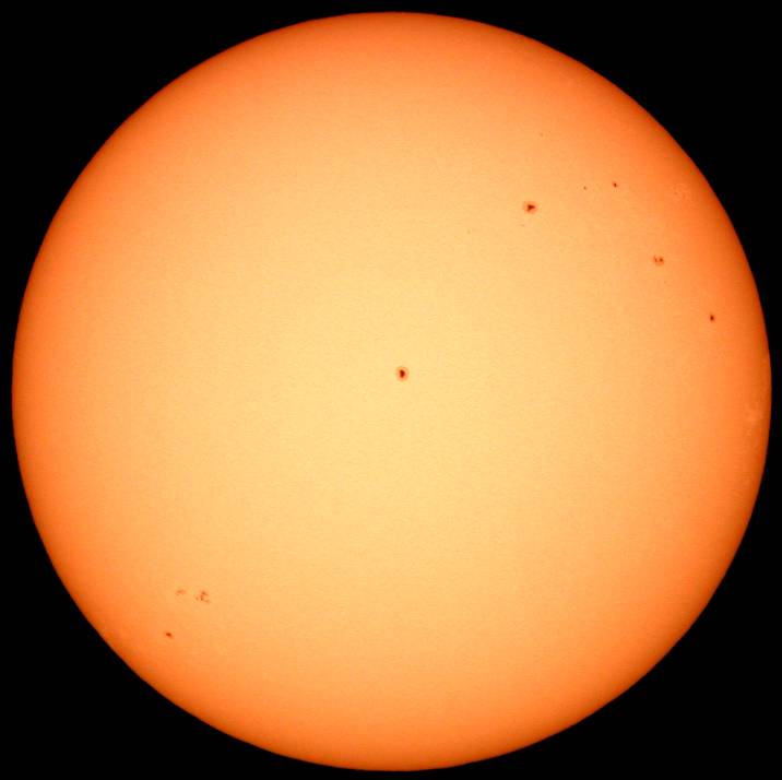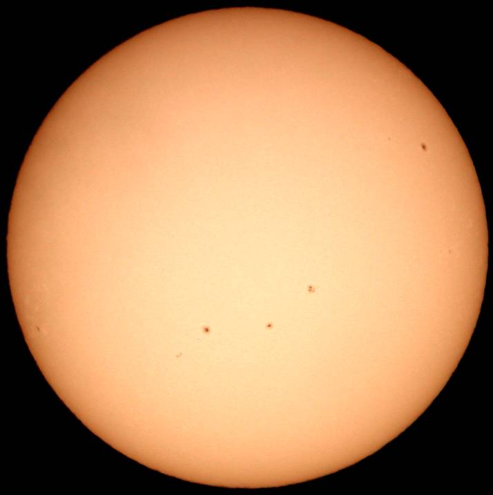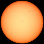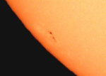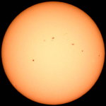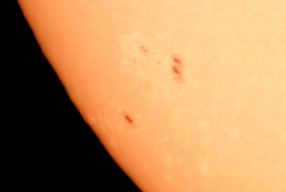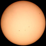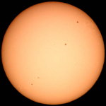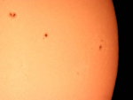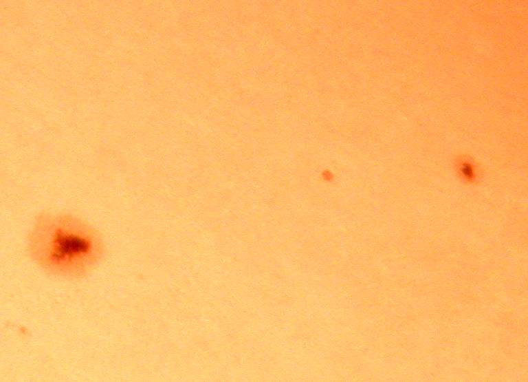 | デジカメ太陽シリーズ 巨大黒点を追え119 ウンザリするような天気です。うす雲を通して光球が確認出来たので、広域のみ撮影したのですが、辛うじて群が確認出来るか出来ないかの写りでした。 |