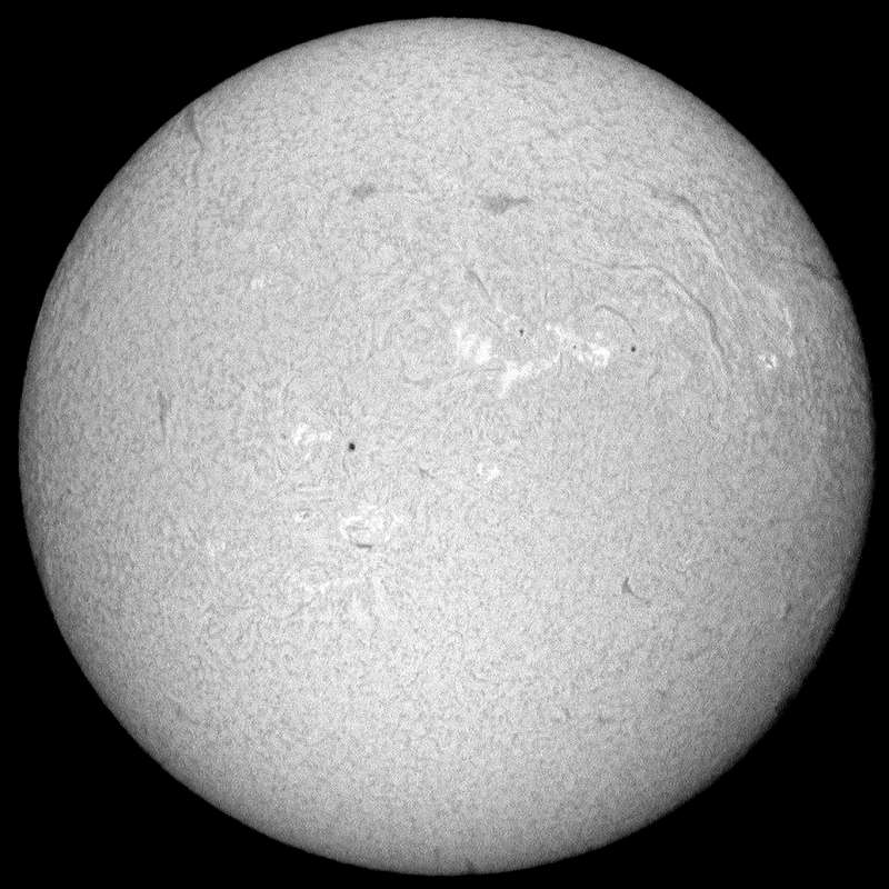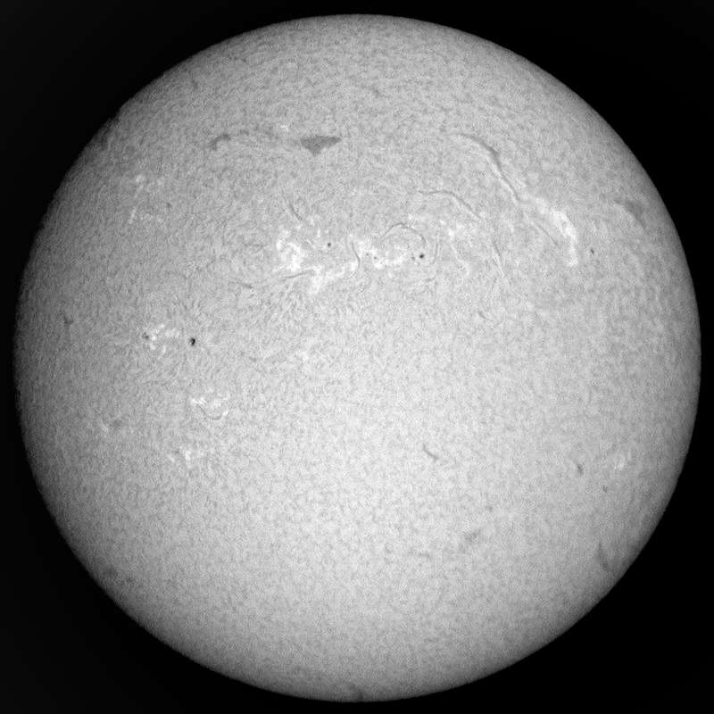 さてさて、可視光では、画像中心の黒点に目が行きますが、その黒点の下に微小黒点があります。Hα画像でも解るように、やや活発なエリアなので今後この微小黒点は要注意です。裏付けは無いが、大きな黒点の周りが活発な事が多いという説の逆説で、活発なんだから、黒点が出来ても不思議では無いと言う怪しい説です。素人のアサハカな考えですが、現状お気楽に観察している身。何か楽しみながら続けないと辛いだけです。当たるか?外れるか?お楽しみあれ…。 |