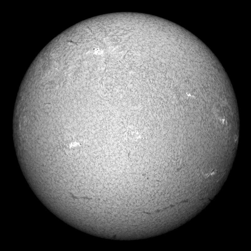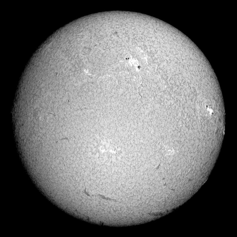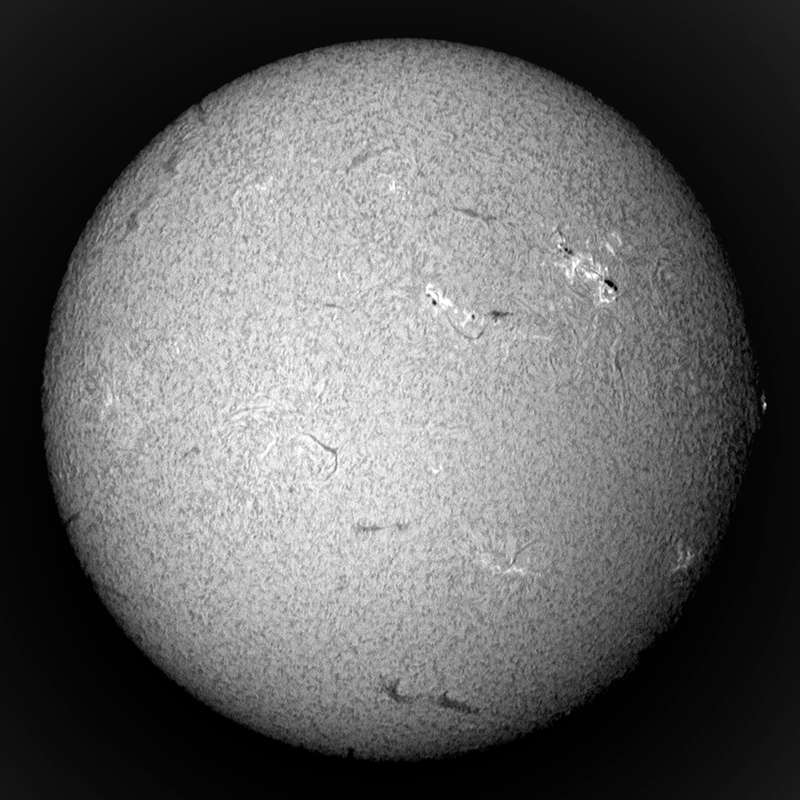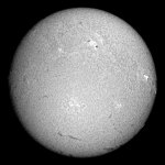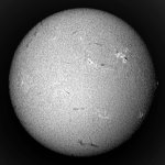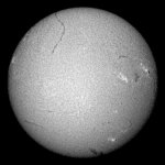 ここ数日、急に黒点が増えて嬉しいかぎりだ。可視光のスポット撮影も、ソコソコの写真が撮れました。ブリッジも確認出来ます。小口径なので、粒状斑ブチブチとはいきませんが、合格点でしょう。Hα光でも、いたる所に今後活動しそうなエリアがあり楽しみだ。南半球にも、それらしいエリアを認めることが出きるが、今回の活動は北半球が中心と言われている事を裏付けるかのように南では育たない事が多い。 |