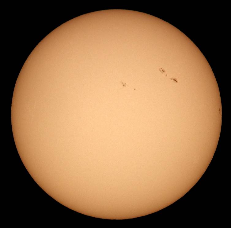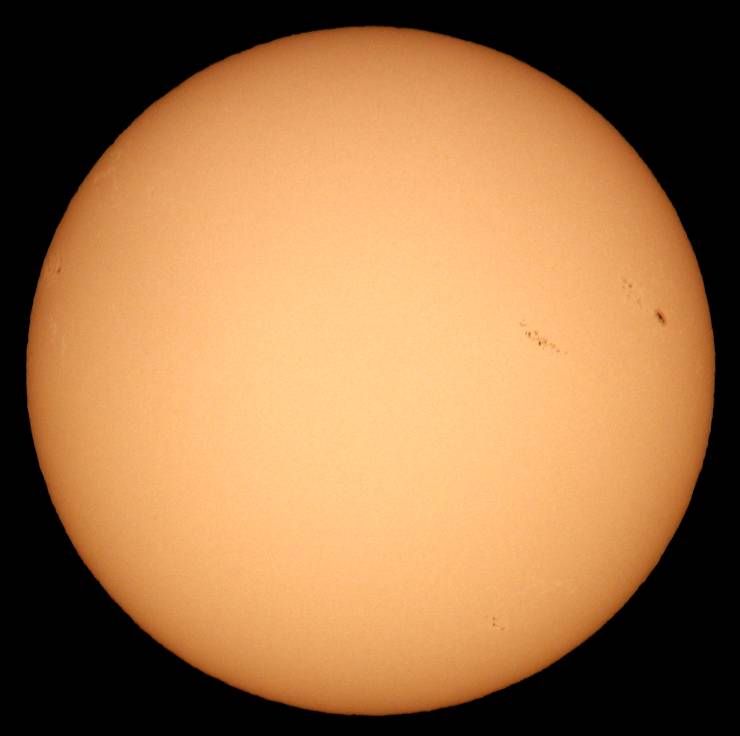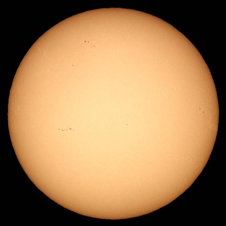 中1日置いての観察です。しかし覗いてビックリ撮ってビックリ。まず、4日に予想していたダークホースの微小黒点が見事に成長しました。後、メインの2群は北半球の群が成長し、南半球の群は衰退しました。南半球の群は多分終わりかな?暫くこのメインの群を中心に観察して行きましょう。ダークホースの群は西没直前です。残念ですが…。それと、北半球のメインの群の南東(画面左)に今後活動しそうなエリアが控えています。可視光でも、微小ながら黒点群が出来ています。