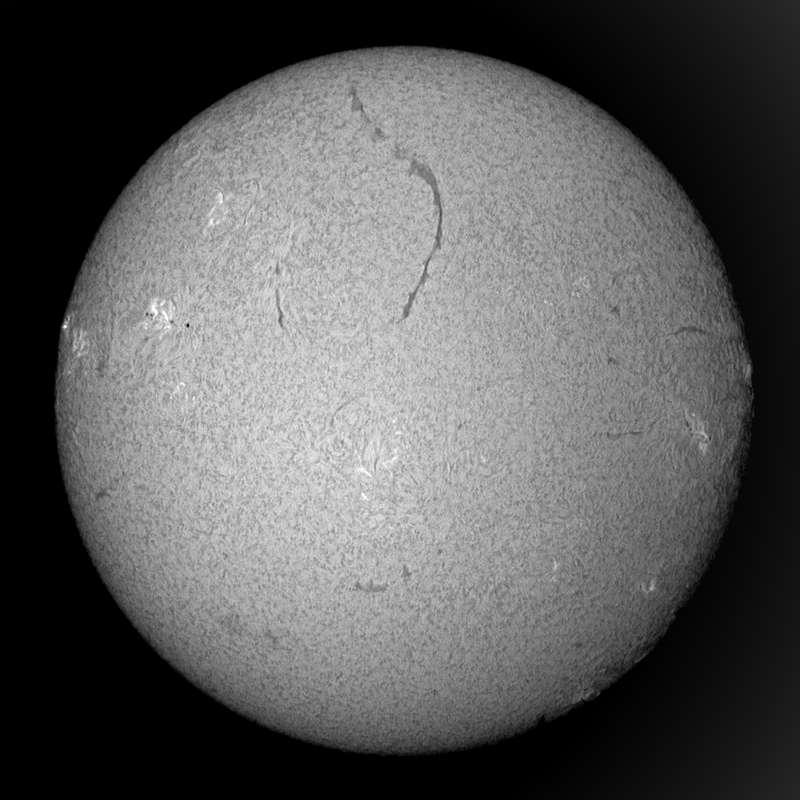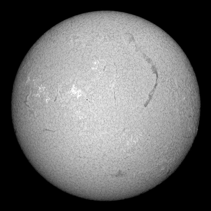 メインの群、成長しだしました。時間はたっぷりある。頑張って巨大黒点になって欲しいものだ。ダークホースの群は、さらに奥の方に活発なエリアが控えているようで、Hαでもプラージが立体的に見えています。この2つのエリアでの大きな活動に注目していきましょう。昨日の画像ではイマイチでしたが、メインの群の北(画像右上)に、黒点の発生しそうなエリアがあります。ここも要チェックです。長いフィラメントは、今日も健在です。このまま西没するまで連続観察出来れば嬉しいのだが、天気が持つかどうか? |