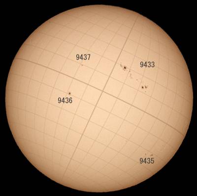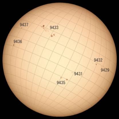 可視光ですが、9433(大黒点の回帰群)はやせたとは言え存在感たっぷり。まだまだ楽しめそうです。ダークホースだった9429・9435の群も確実に成長しています。