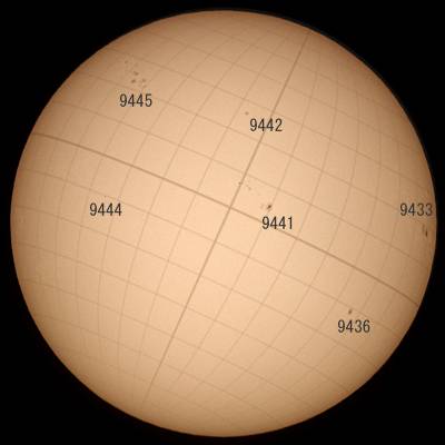 GW初日。天気は曇り。辛うじて可視光のフルディスクのみ撮影。新たに2群東出しているようですが、余りにも画像が酷いので、群番号の特定は明日以降に持ち越します。また9441と9445の間に一群出現しています。この群の番号の特定も明日以降同時に行いたいです。 |