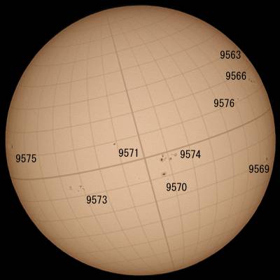 9570群の上に出現した群は9574群です。その他各群番号は下記の通りです。9573群も活動エリアが広く今後楽しみな群です。西没前の群たちは黒点こそ大きくなりませんでしたが、最後まで活動的なまま西没しそうです。