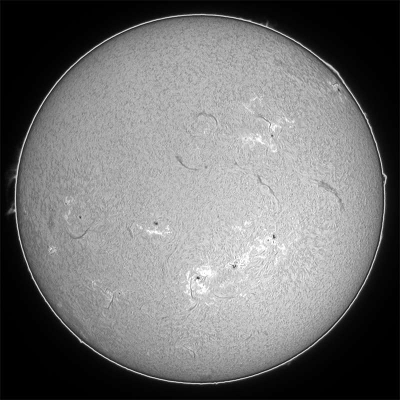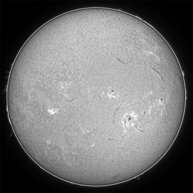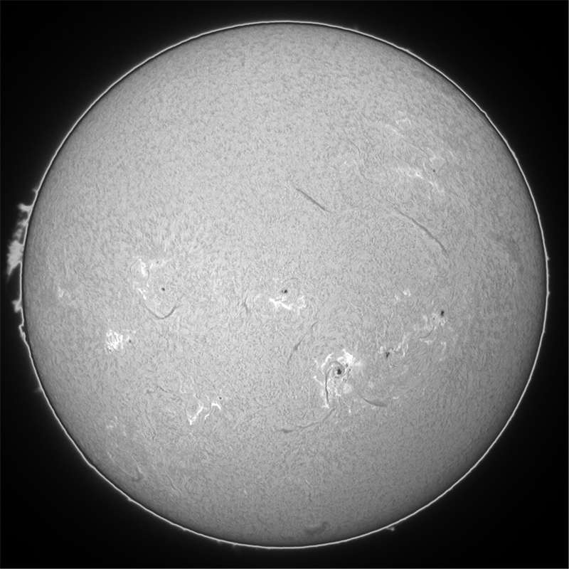 Hα光ですが、撮影開始時、9672群でフレアが発生していました。しかし、シーイングが悪く、良像が得られませんでした。その後暫く雲が通過し、30分後、再度撮影再開したところ、フレアは終了していましたが、嘘の様なシーイングの良さ。撮るコマ撮るコマがみんな良くて、選るのに苦労しました。この時の現象は10月23日11時11分発生M6.5フレアと思われます。 |