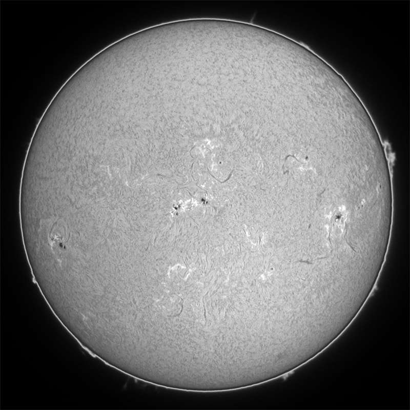 Hα光ですが、9672群は引き続き活発な状態が続いています。今回東出してから3回Xクラスフレアを引き起こしています。昔、この渦巻き模様を見て、太陽面でも台風が発生していると考えた学者さんがおられたらしい。確かに台風のように見える。 |