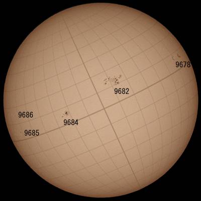 9682群が活動のピークを迎えているようです。可視でやっと成長が止まりました。意外だったのが9684群です。可視では殆ど成長は認められませんが、Hαで見ると想像以上の活動領域を伴っている事がわかります。今後要注意です。9678群は西没間近です。後、太陽面の東、画像左下ですが、昨日もループプロミネンスが出ていましたが、活動的な領域が控えているようです。この領域の東出も楽しみですね。 |