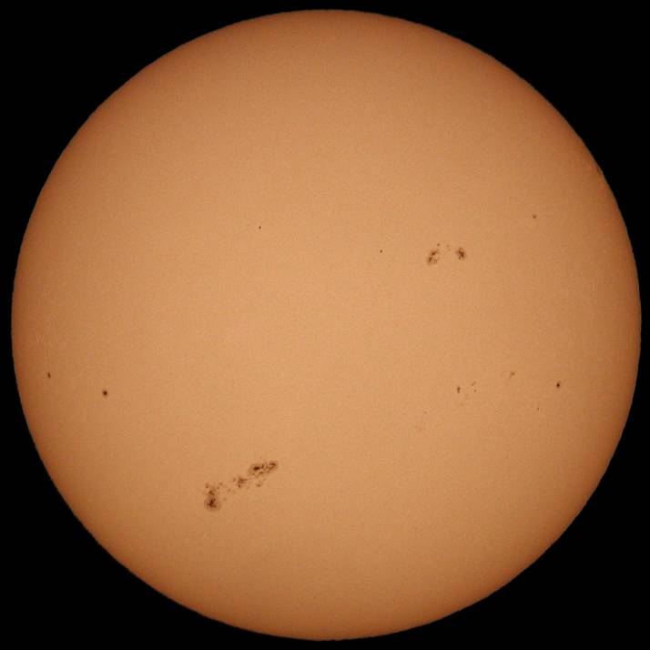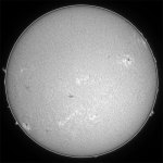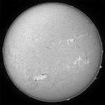 天気が悪い、しかし昼休みに雲間から太陽が覗いた瞬間に可視のみ撮影。9687群の上の群は9685群でした。右の群は9689群。そして東出した群は9690。この群、そこそこ大きい。世間を賑わす程の巨大黒点ではありませんが、存在感のある黒点には違いありません。その他の群は、今のとろこ、特に異常無し。 |