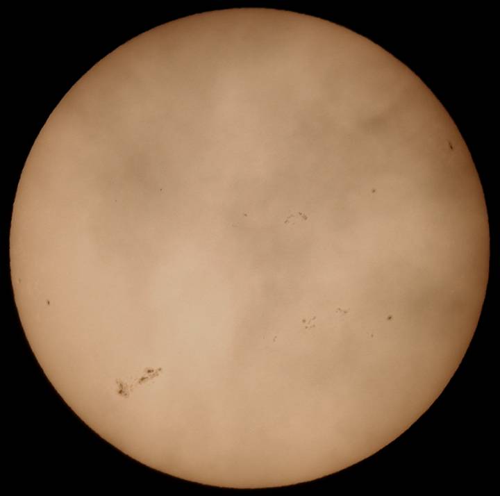 昨日の事があるので、曇天にもかかわらず、晴れ間待ちです。昼ご飯を食べながら、望遠鏡をセット。そして、辛うじて雲が薄くなった瞬間にパシャリ。撮れました。そして、見てビックリ。9690群は言うまでもありませんが、一番驚いたのは9685群の左です。一日にして黒点群が出現しています。画像中央やや右です。 |