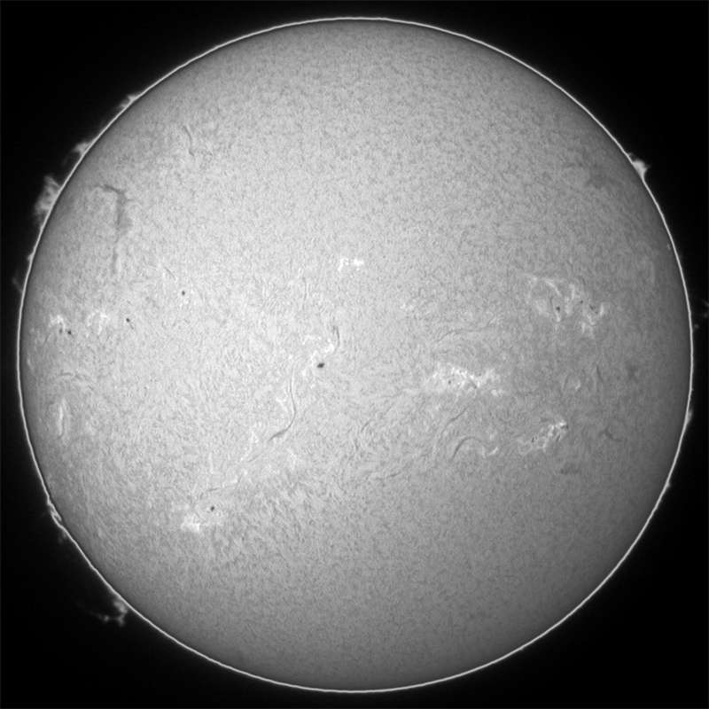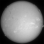 ついに出現?南東(左下)に群が東出しました。先日Xクラスフレアを起こした領域と思われます。群番号を同定していませんが、フレア情報もある9767群と思われます。太陽面は微小黒点天国の如く、群数はあれど巨大黒点無しって感じですね。ただ、その中で、今回東出した群は、目を引きます。しかし、Hαでは、至る所にやや活発な場所があります。決して不活発では無い事を物語っています。