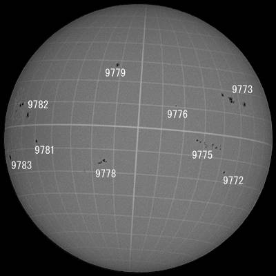 9773・9775群は、可視ではやや停滞気味か?しかし、エッジにさしかかった分を差し引くと、決して停滞では無いと思われますが…。9778群は過去の遺産か?恐らくここで過去に大きな活動があった場所なのだろう。その遺産を継承していると思われます。昨年10月以前までさかのぼるのは勘弁して頂いて、10月に9672群それ以降9704→9738→9778となる?かなり長命な活動領域ですね。面白いのは群の中心緯度が2度程赤道よりになっています。太陽の非活動期は、黒点が赤道に寄ると言うモデルにぴったりの現象です。