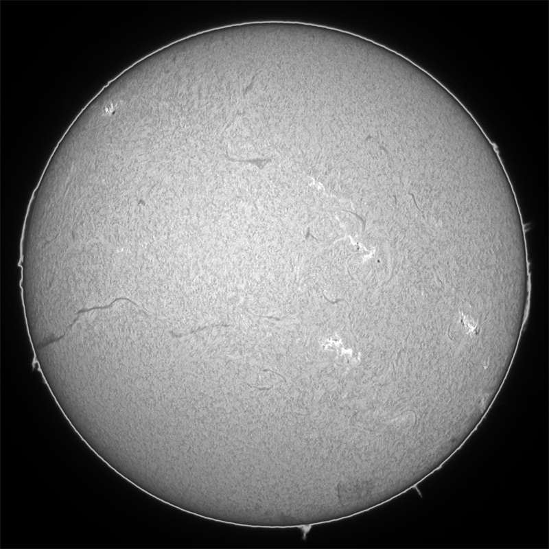 今日から、朝の出勤前も撮影可能になりました。朝の高度が高くなるまでは、暫く昼と重複観察していく予定です。久しぶりの朝の観察です。やはり気流は朝の方が安定しています。高度が低いのと、お隣の屋根すれすれなのを差し引いて、昼と良い勝負でしょうか。さて、太陽面ですが、異常に黒点が多い状態です。群だらけですが、各群小さくて、何とも表現のしようがありません。何か変化が起こってくれれば良いのですが…。 |