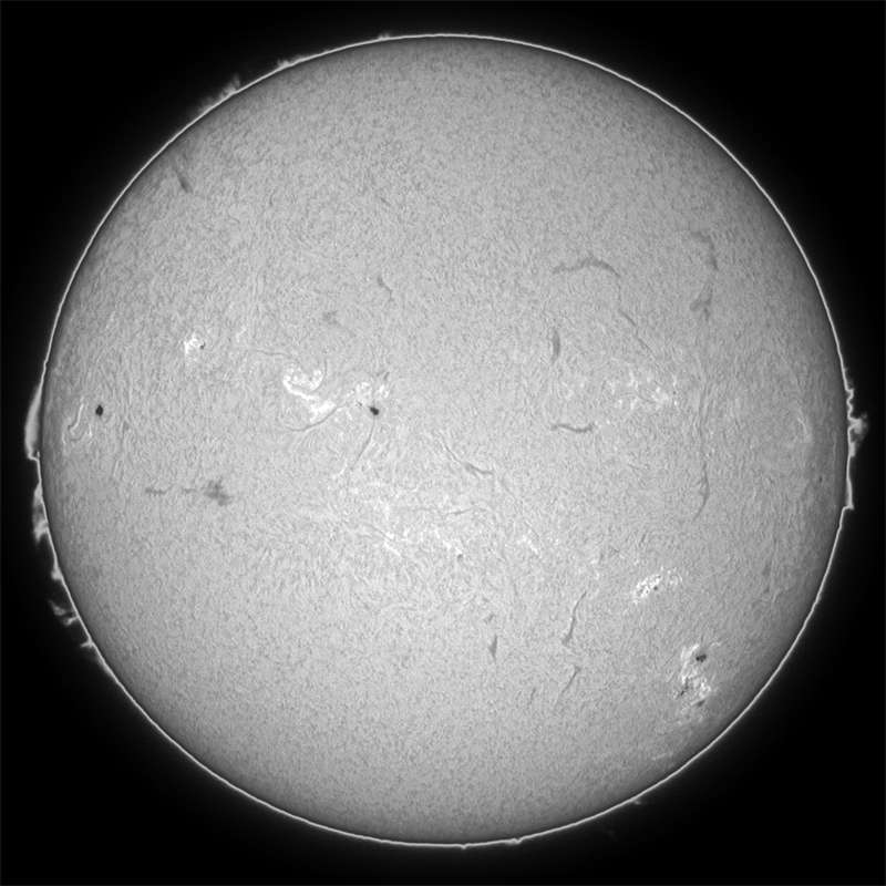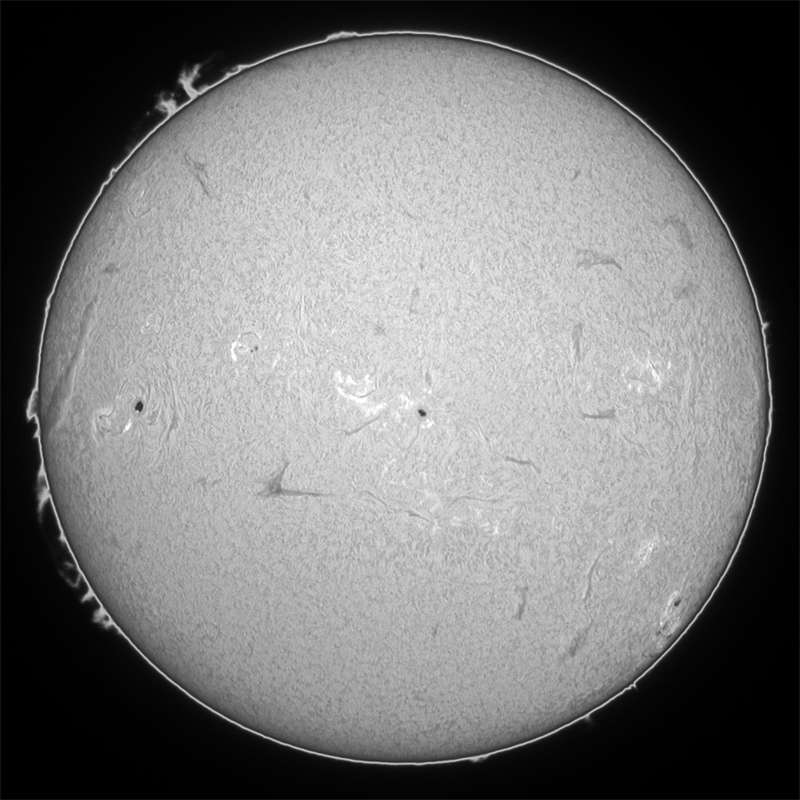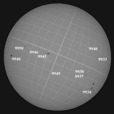 梅雨?何でこんなに天気が悪いのだろう。先週の月曜日以来の観測です。9934群は子午線を挟んで反対側まで移動。西没モードです。そ間の詳細は不明ですが、大きくなっているところを見ると、活発だったのだろうなあと想像しています。残念だ。そして、明日以降も決して天気予報は良くありません。今月は私の観測日記の中で最低の月になる事は免れまい…。 |