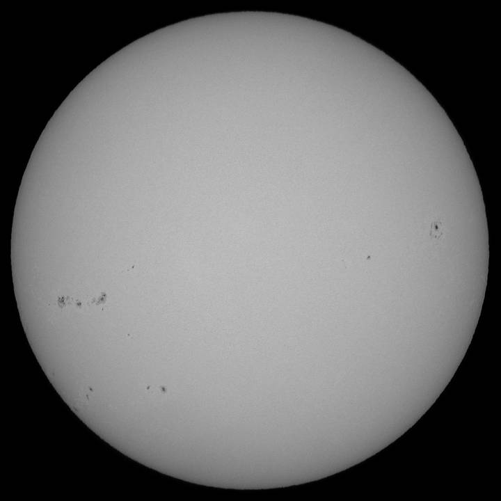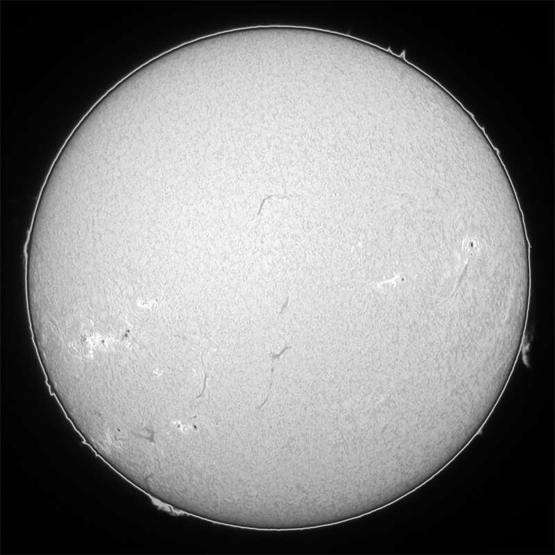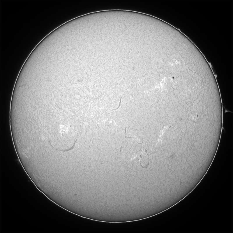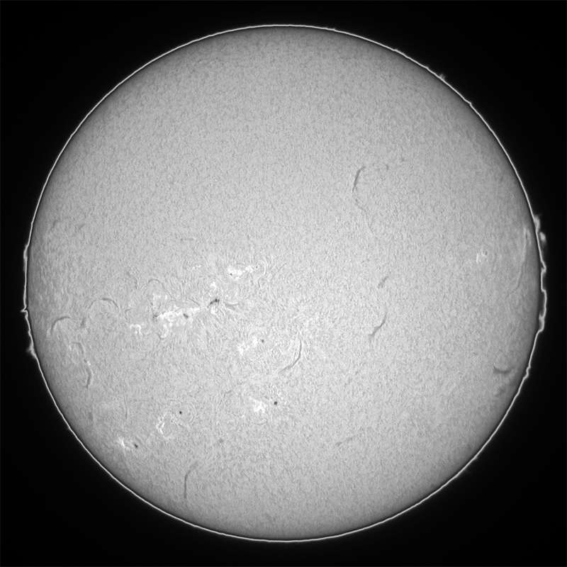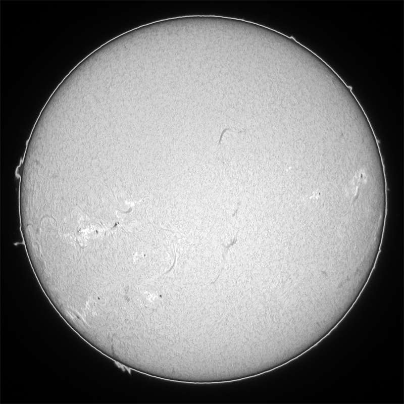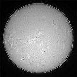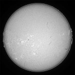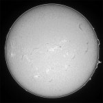 0095群はピークを過ぎて、若干ですが衰退傾向が確認出来ます。他のエリアでは0096群と0097群がやや成長し始めています。今後の動向に注意して下さい。今日はシーイングが良く、可視光スポット撮影もHαも納得のゆく画像が得られました。Hαはシーイングが良かったので露光調整を解除しました。この方が画像のレンジが広くなるので、美しく仕上がります。今日も大黒点の回帰を確認出来ません。明日か…。消滅か?いくら活動期を過ぎたとは言え、半周で消滅? |