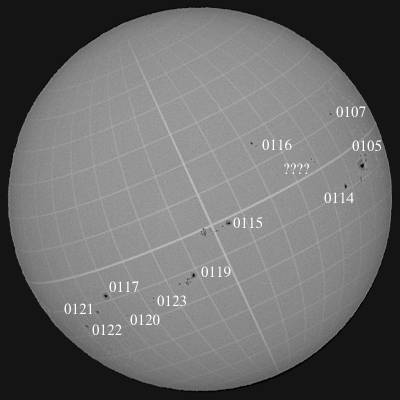 0119群は目立ったフレアは起こしていませんが順調に成長しています。画像中央下に来た、謎の群ですが、一番下が活発そうです。Hαだけでは無く、可視でも成長を確認出来ます。いい加減に群番号を調べれば良いのですが、日曜日・水曜日と決めているので明日までお待ち下さい。 |