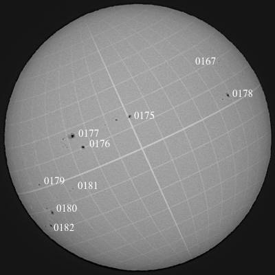 0181群。予定通り?消滅しました。0180群に取り込まれたようで…。その0180群は依然成長を続けています。0177群も含めて要注意です。Hα光でチェックすると、東出した0185群の更に東側に活動的な領域があります。よって、現在の太陽は、この3群が要注意エリアです。ここ3日、目立ったフレアは発生していませんが、そろそろ…? |