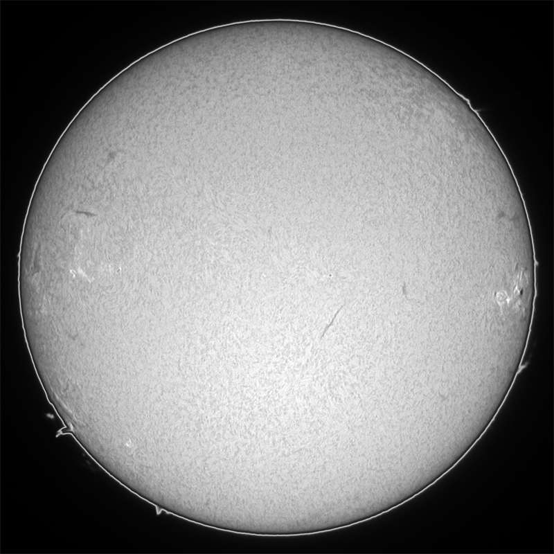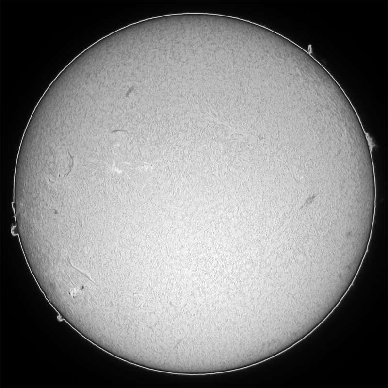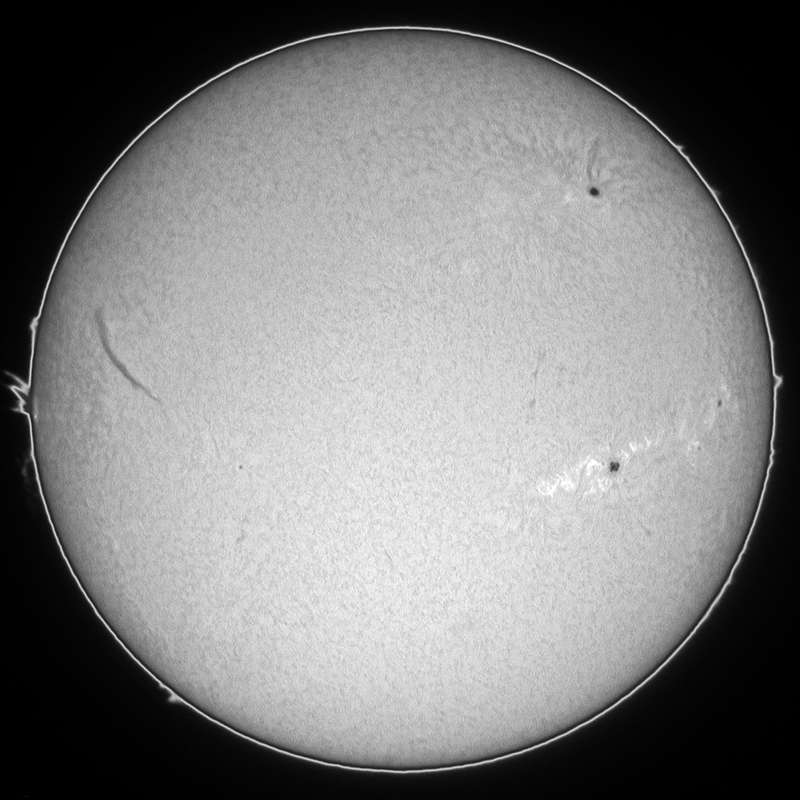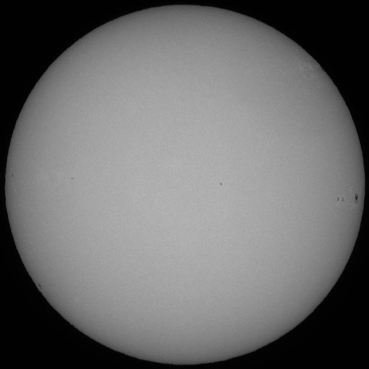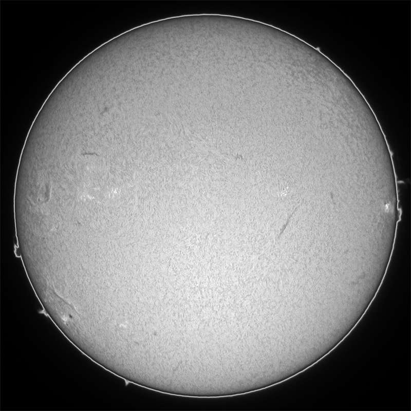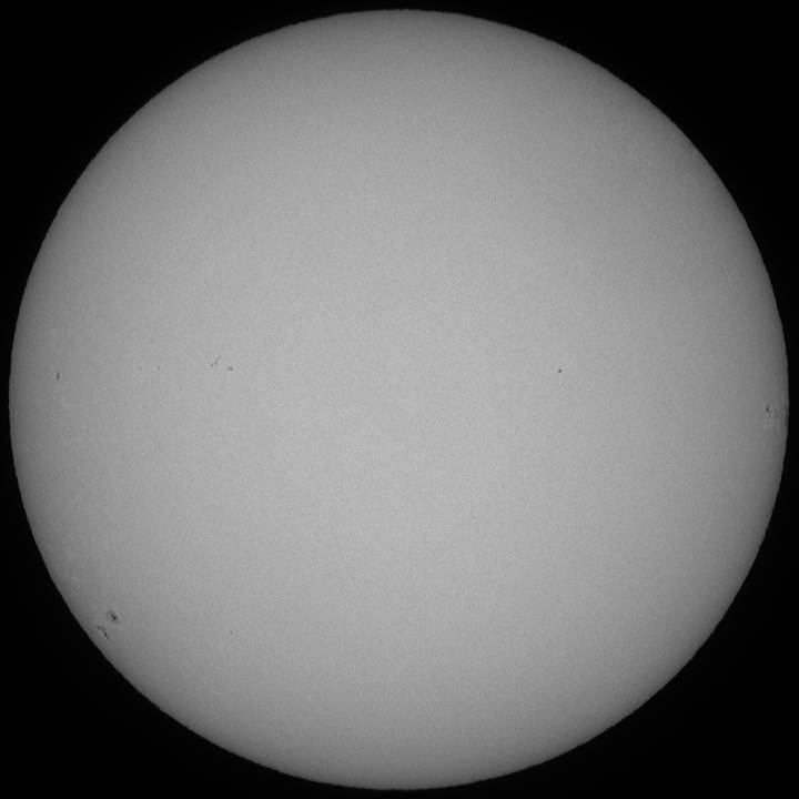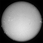 イマイチぱっとしない週始めから、ズルズルと悪天候が続き、もう週も半ば…。そして追い討ちをかけるかの如く、ノッペラボウ直前の太陽面。NOAA発表後に東に二群東出を確認したが、それでも…。寒い!寒すぎる…。ただ、偏西風が入っていないようで、シーイングは想像以上に良かった。 |