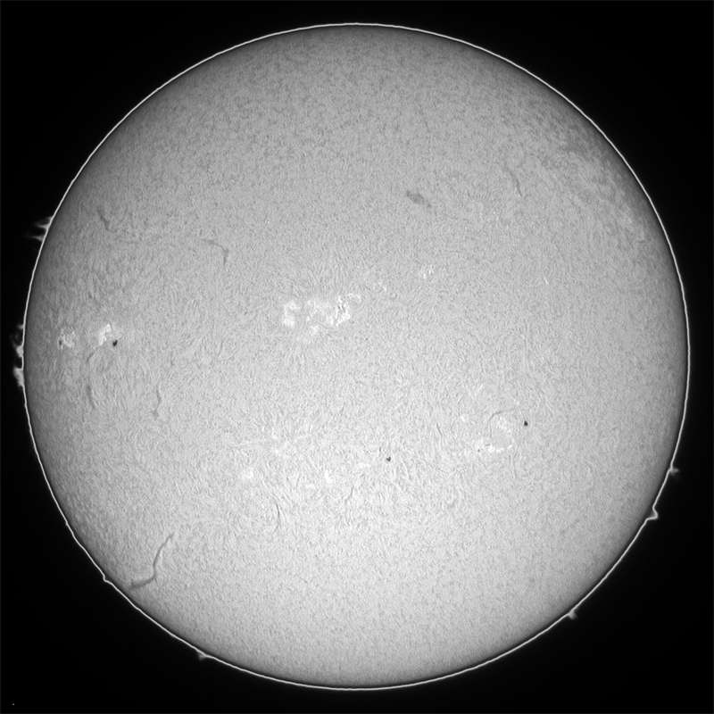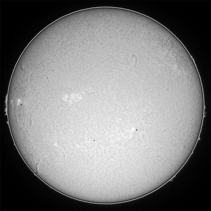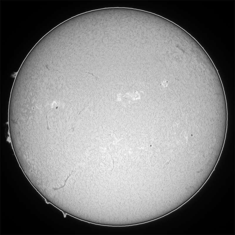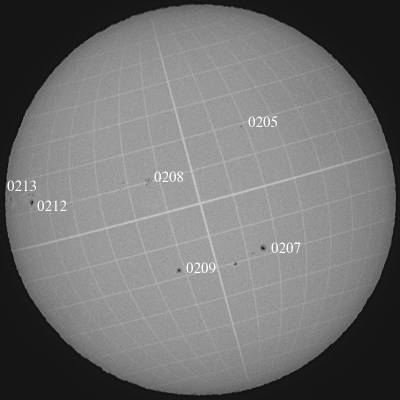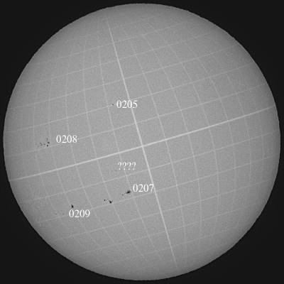 0207群の活動領域は益々元気がなくなってきました。0208群の領域は、サイズこそ大きくありませんが、まだ活発そうです。そして、東のエッジにまた別群が昇ってきました。サイズは?ですが、Hαでは妙に輝いているとろこが気になります。もう少し正面に周って来ないと何ともいえませんが…。 |