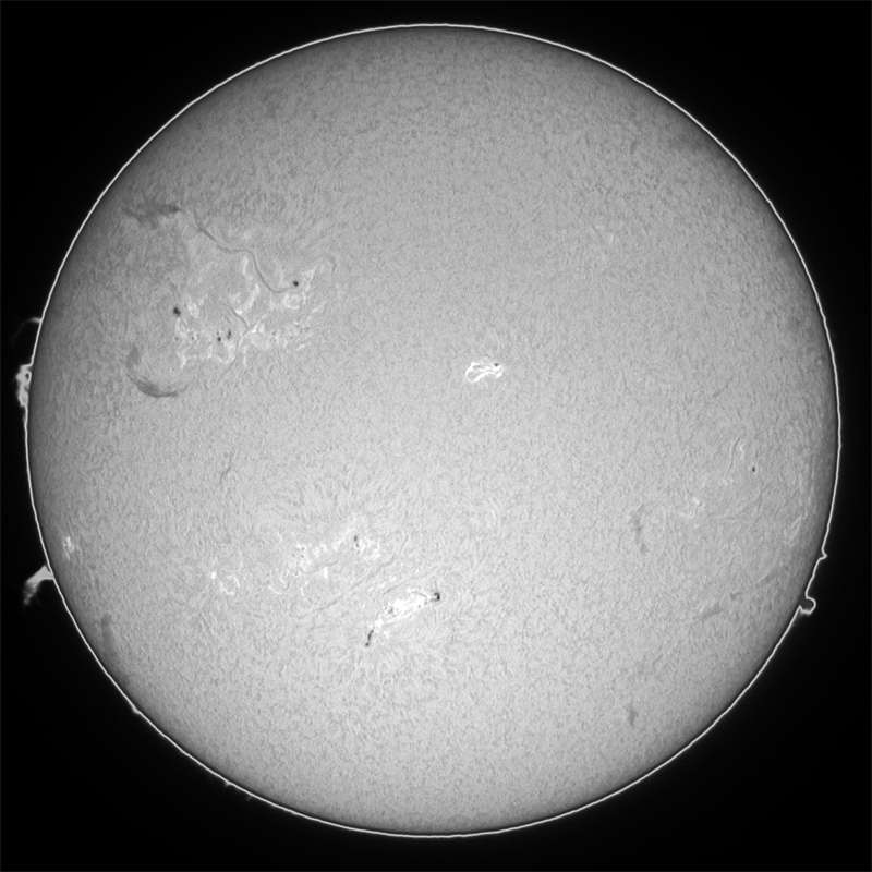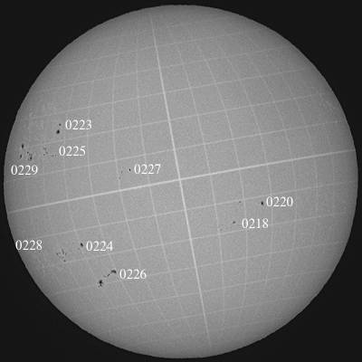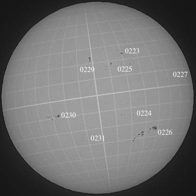 群番号を調べました。下記の通りです。群番号は細かく分かれていますが、北は0229群を中心に、南は0226群を中心に一塊の大きな活動領域内で発生しています。0220群付近は衰退傾向が顕著で、西没までもつかどうか?今回、イチオシで注目しているのは、0226群です。この時期に、南緯30度近くで発生しています。赤道付近に活動の中心が移っている昨今では貴重な群です。この位置で、更に成長出来るのか…。または他の群よりも、すぐに衰退するのか?とても見物です。 |