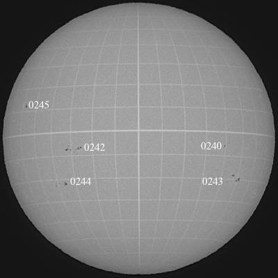 先週末、近日点の話ばかりで、肝心の太陽面の話を忘れていました。仕切りなおしです。太陽の右斜め下にある群は、てっきり0239群と思っていましたが、0239群は消滅?し、0243群として発生した群でした。そして、先週末3群程東出を確認していましたが、その中で注目できそうな群が0242群です。久しぶりの注目群です。前周の活動が確認出来なかったので新群?南半球のLo210台南緯8度近辺。黒点分布グラフで確認したが、昨年7・8月に活動した場所に近いが少し、西のようだ。 |