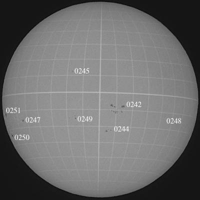 東から3群のぼってきています。0247・0250・0251群です。特に注目って訳ではありませんが、0251群が東出早々にM4.9と大きなフレアを起こしています。0244群は0242群に眼差しを奪われている格好ですが、やや大きなフレアを起こしました。伏兵ですね。さて、0242群は更に成長しました。ただ、少しペースが…。この辺りが限界?