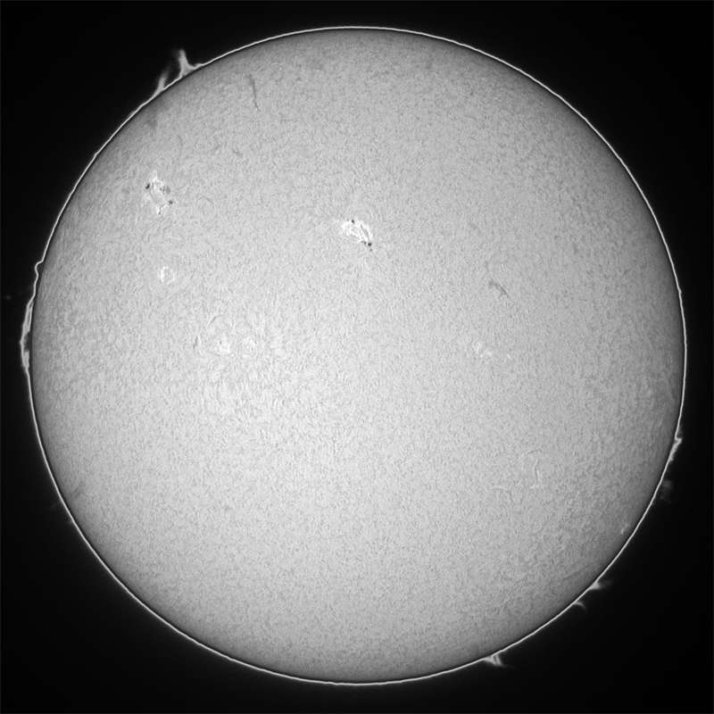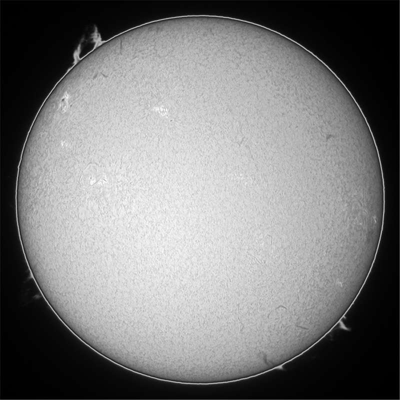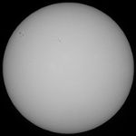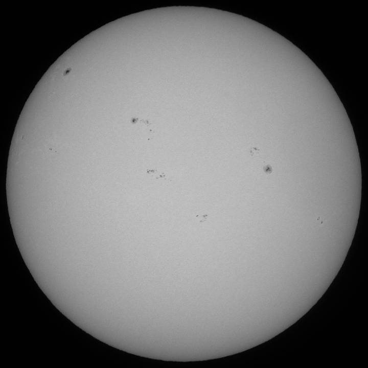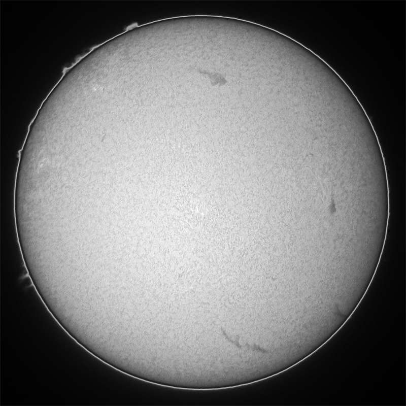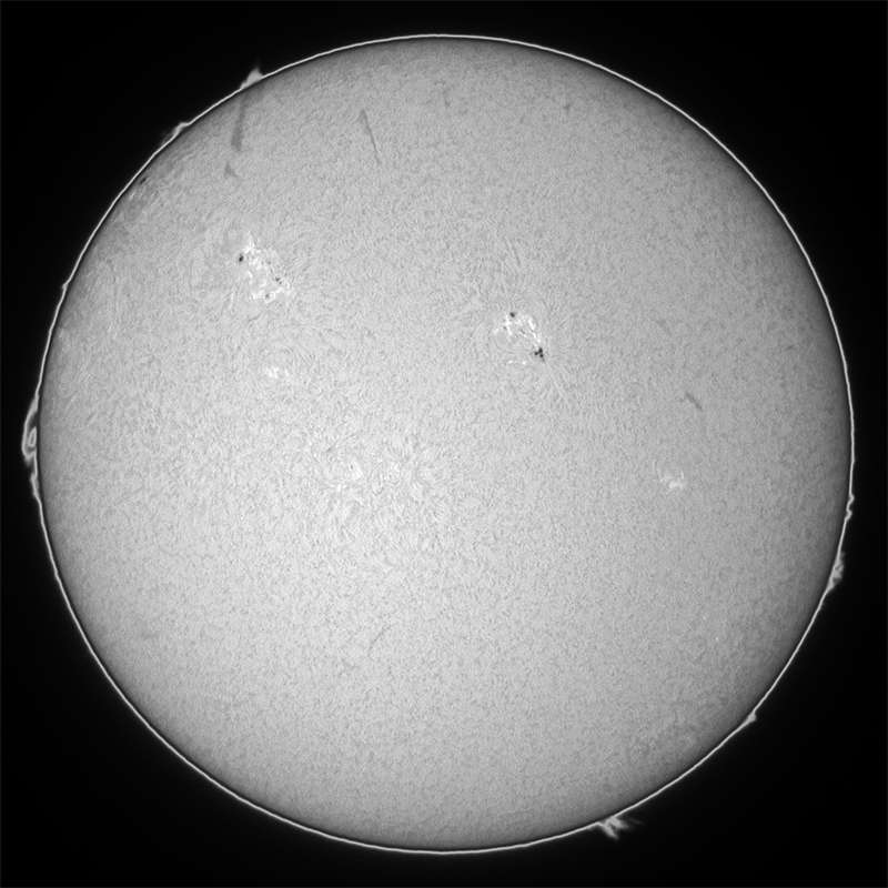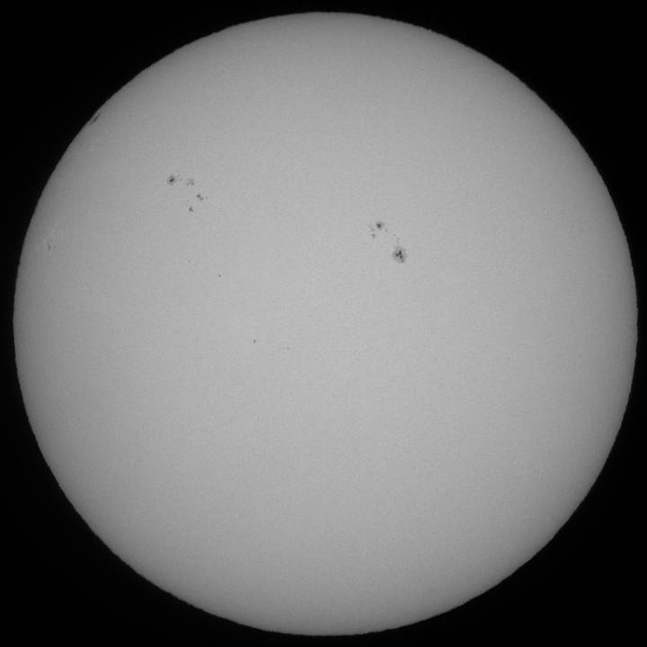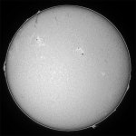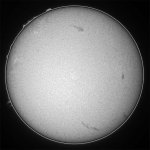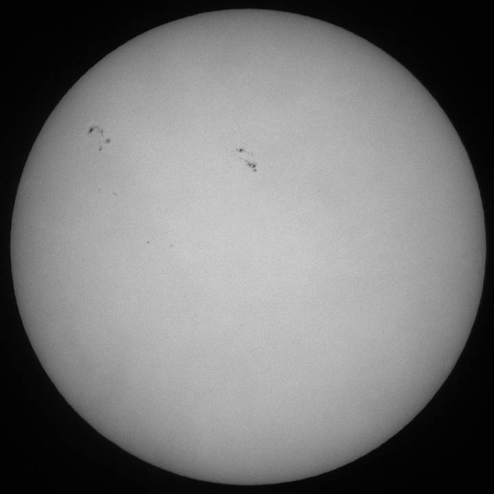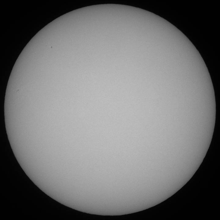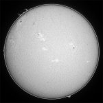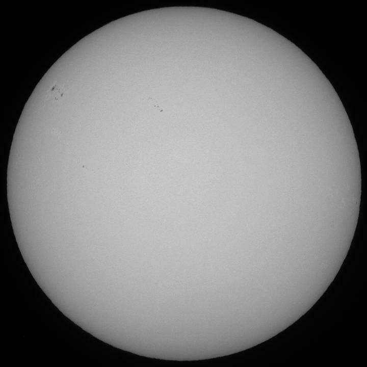 今日も霞み。しかも昨日より酷い?でも、シーイングがマシだったのでHαも辛うじて撮影出来ました。まず、可視ですが、北半球に一群出現し、最悪の状態から抜けつつあるようです。無黒点は回避出来たもよう。一安心。 |