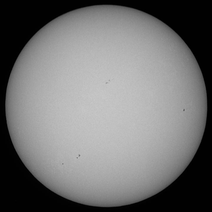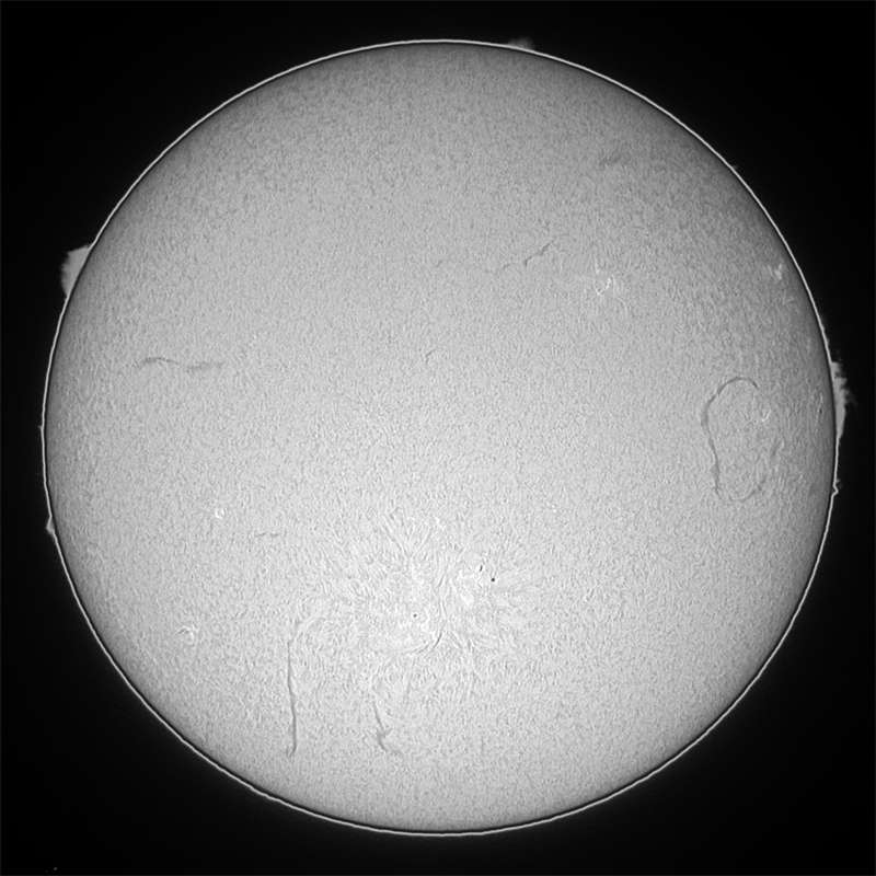 可視で見ると何と寂しい太陽面だろう。これだけだったら観測続けていなかっただろうな…。しかし、Hαは違うのだ。プロミネンス。フィラメント。そして、黒点を取り巻く活動領域。やってて良かったHα。 |