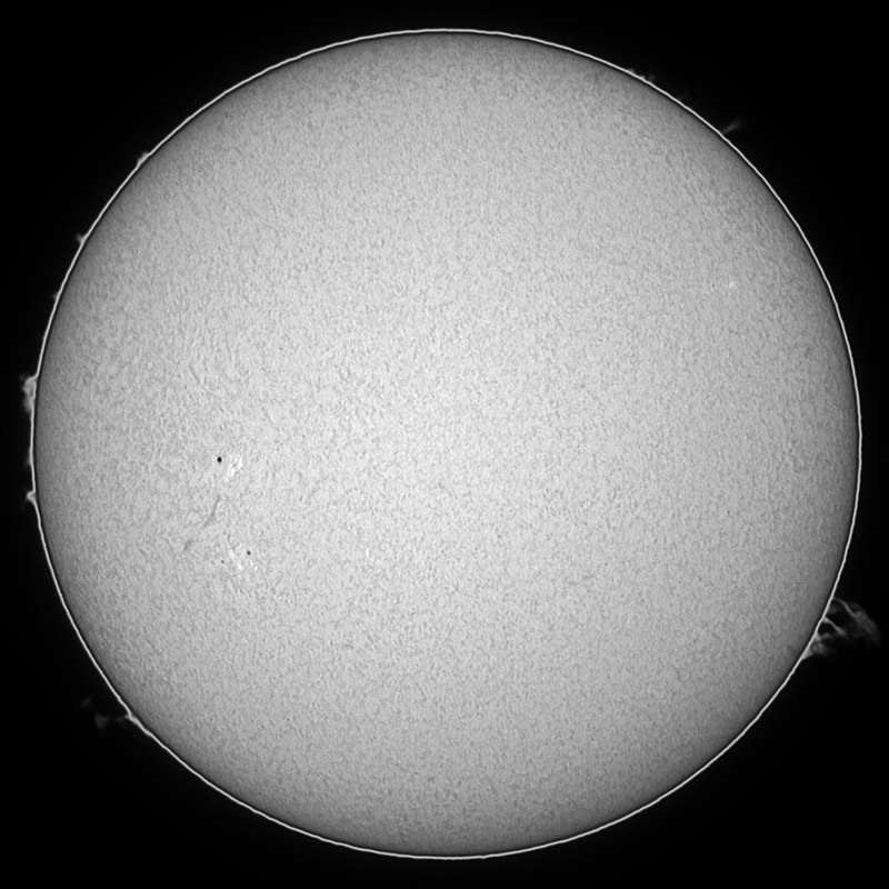 う〜ん。コメントに困る太陽面です。先日から南半球にへばりついていたフィラメントが西のエッジで綺麗なプロミネンスとして見えています。そして東にもプロミネンスがありますが、サージプロミネンス?微妙ですね。静的プロミネンスなら2〜3日は観察出来るでしょう。 |