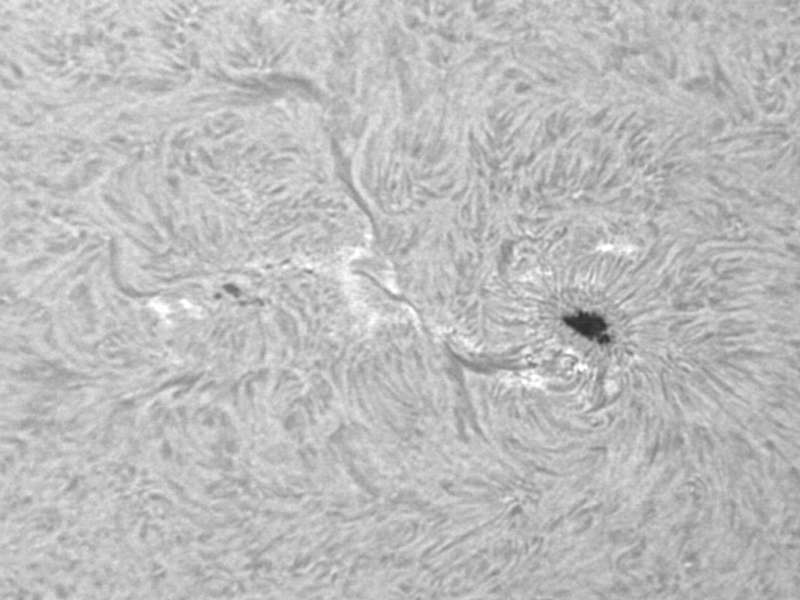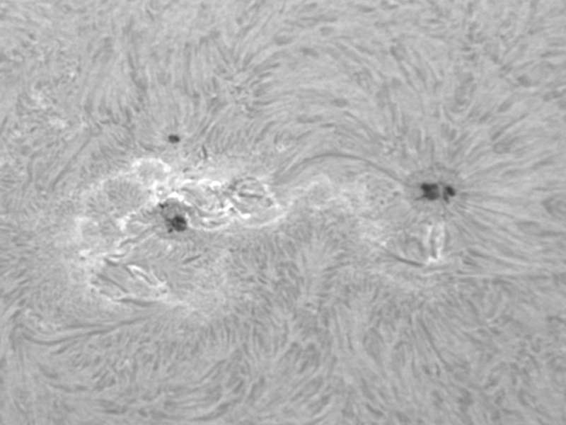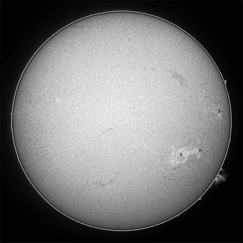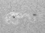 朝の一瞬の雲間に撮影出来ました。うす雲を通してなのでイマイチの画像ですが、幸いシーイングが良かったので物になりました。さて、0635群ですが、観測中に小さなフレアを起こしていました。また西のエッジには見事なプロミネンスが出現しています。22日の画像ではフィラメントとして写っていますね。結局、0635群は大人しかったですね。でも、変化がとてもゆっくりなので、最回帰してくれると嬉しいですね。それを期待しましょう。 |