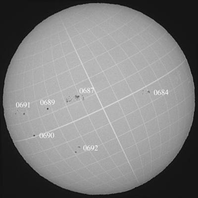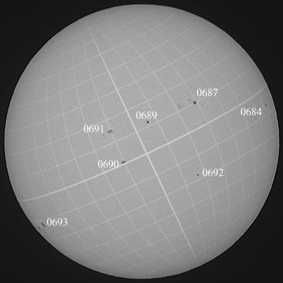 折角の機会なのに、この悪天候だけは…。何とかならんもんかな…。結局0687群の美味しいところを見逃したようで…。ただ、依然として黒点数が多いことと、東から一群東出した事を考えるとまだまだ楽しめそうな太陽面ですね。因みに東出した0693群も新群です。 |