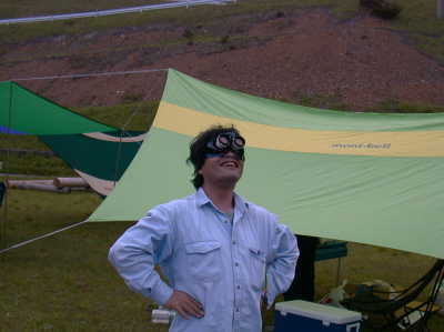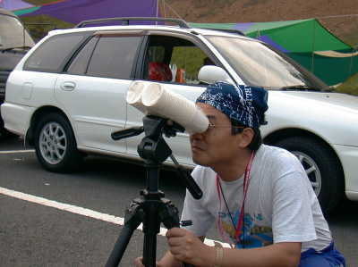 即席太陽双眼鏡!(ただの紙コップ)危険ですので真似をしないで下さい。でも、この人が覗くとそれらしく見えるところが恐ろしい。
