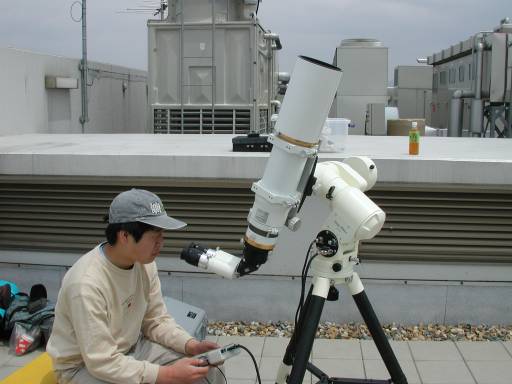 100mm屈折。ダンボールはアイデアですね。昼間は瞳孔が絞られてアイピースが覗きにくいのでダンボールの日除けは最高です。 |