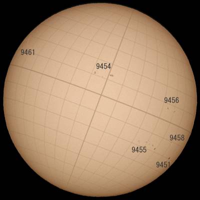 9451群の北に一群出現しました。巨大黒点の活動エリアは今日も回帰は認めれず。 |