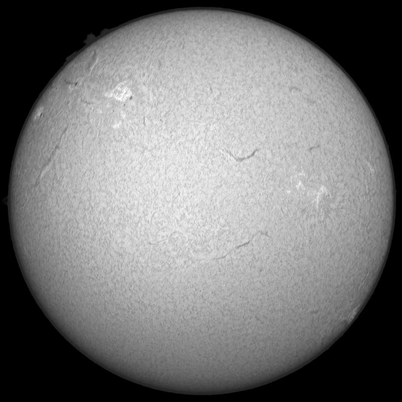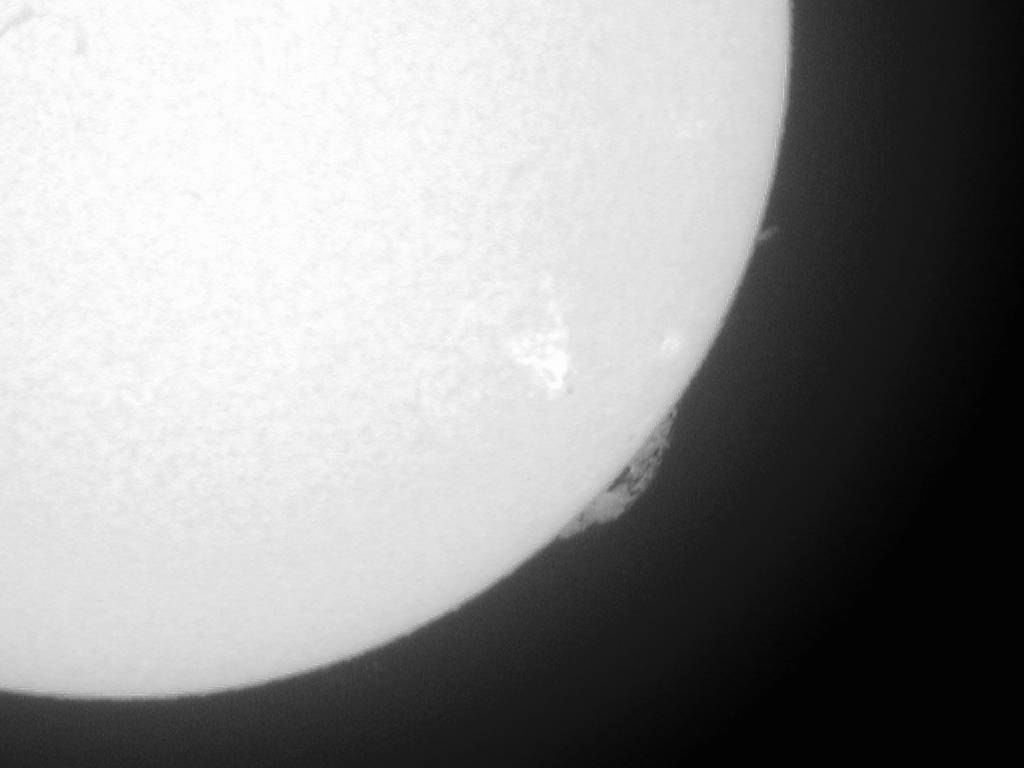 何と冴えない画像だろう。可視光はまずまずだが、Hα光があまりにも見れた物では無かったので、西のエッジにあったプロミネンスを強調して処理しました。 |