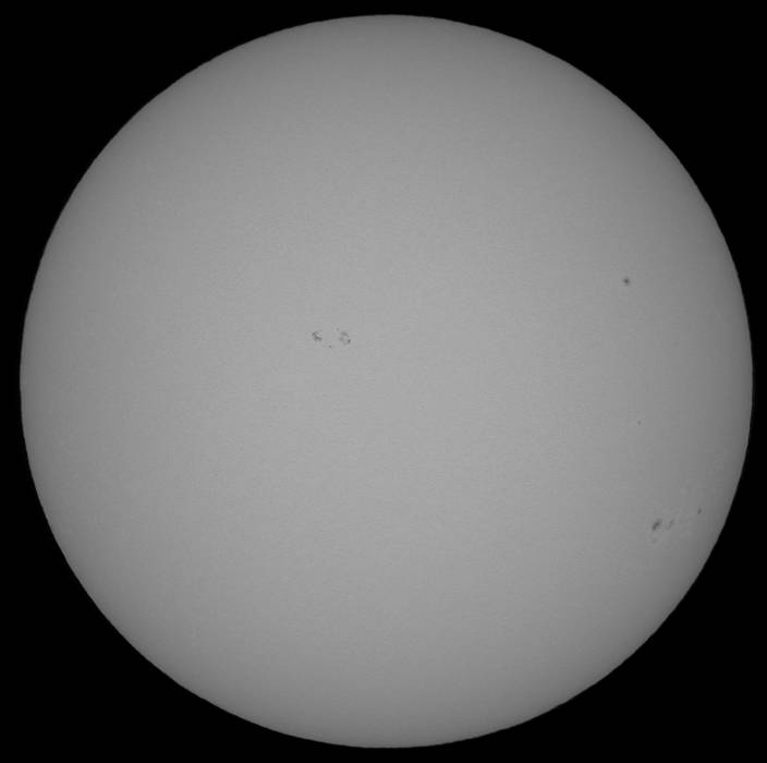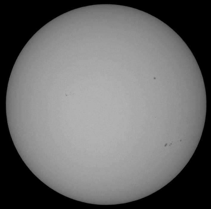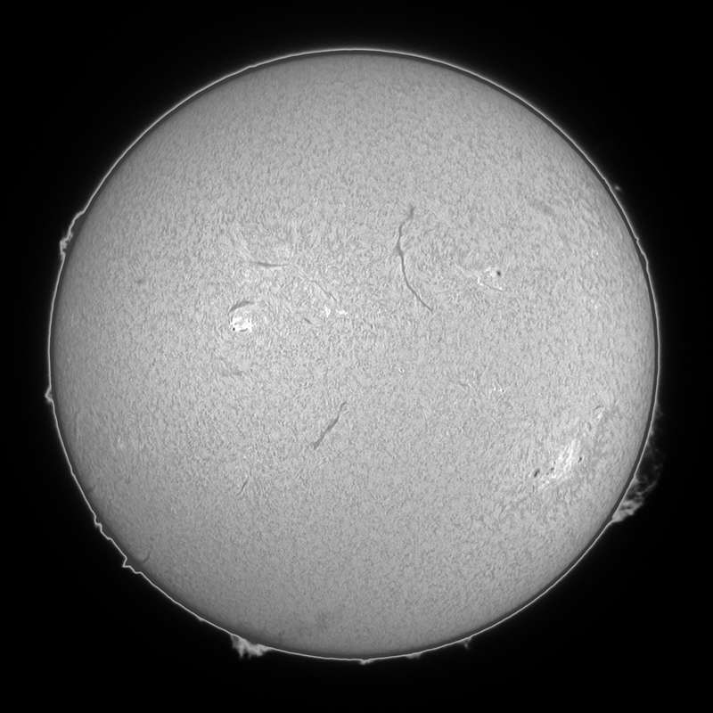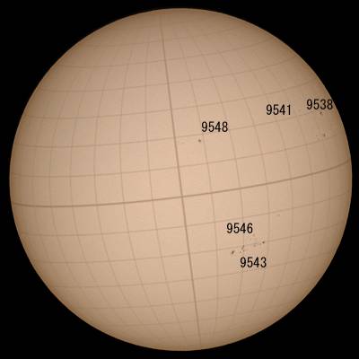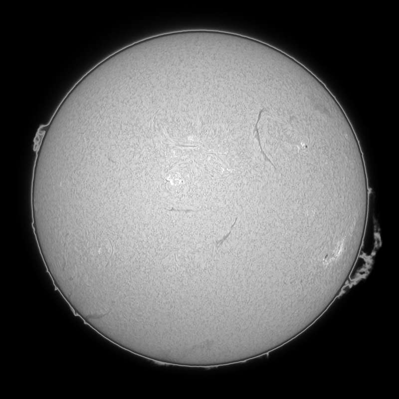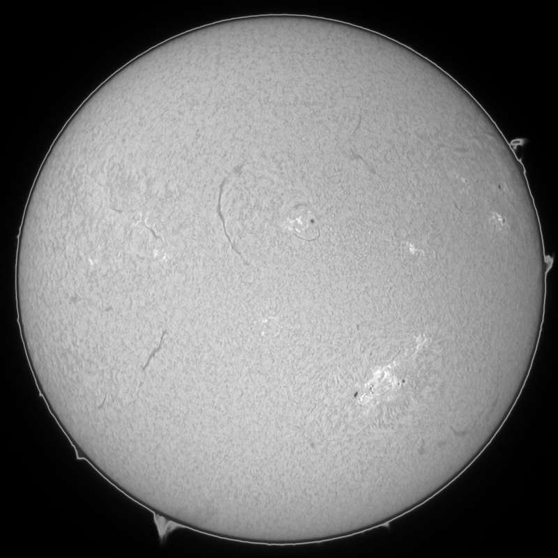 可視光をモノクロで撮影してみた。しかしイマイチ画像処理の仕方が解らない。カラーの方がマシか?北半球の9548群の左に新たな群が発生しました。23日の可視光の画像では兆しすらありませんでしたが、23日のHαの画像を見ると、黒点が出現する兆しを見出せます。今後楽しみな群です。南半球の9543群はサイズこそ決して大きくはありませんが、美しい群です。可視・Hα共に楽しめる群です。そしてこの群の右。西のエッジにプロミネンスが出現しています。23日のHαの画像では9543群の西にフィラメントらしきものが写っていたので、コイツがこのプロミネンスだろうか? |