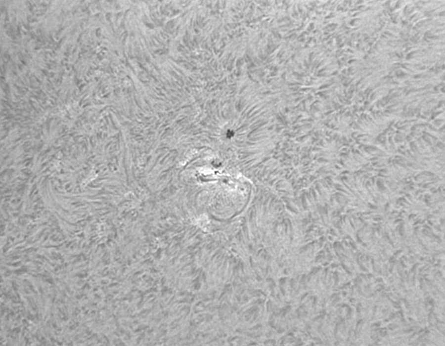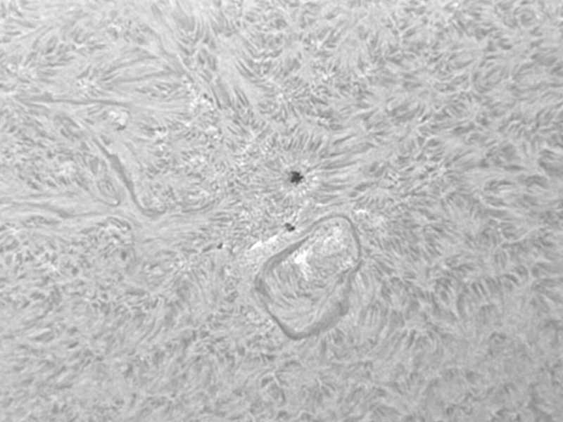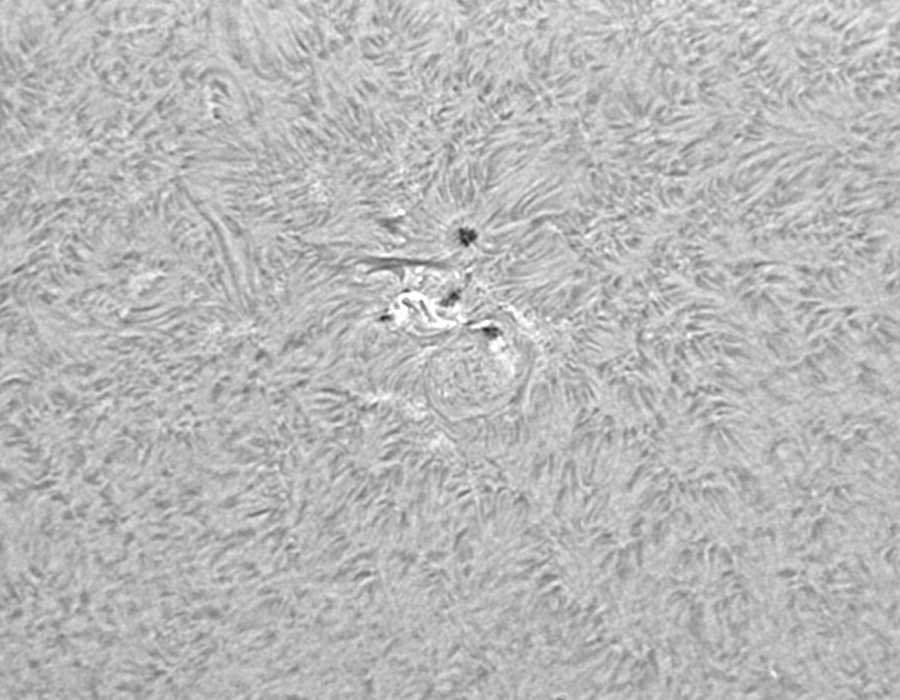 注目?群ですが、黒点数が減少し始めました。衰退していますね。ただ、今日はとてもシーイングが良かったので、Hαスポット撮影してみました。小さな群でも迫力ありますね。このシステムで超巨大黒点撮ったらどうなるんだろう?次の活動期が楽しみな今日この頃…。 |