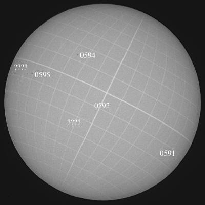 群発生しましたね。どうやら0595群です。ただ嬉しい誤算で、さらに東にもう一群ありそうです。まだ群番号は不明です。ただ、非常に残念な事に折角の晴天もここまでのようです。明日以降天気が悪いらしい。何で!折角の群なのに…。 |