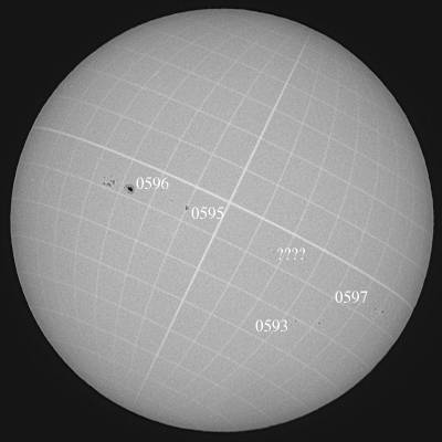 ????群は0596群と判明しました。この群イケテますね。Hαスポットも好シーイングに助けられ凄い画像が撮れました。ただ、中2日空いたのがとても残念。どのように成長したのかとても興味があったのですが…。 |