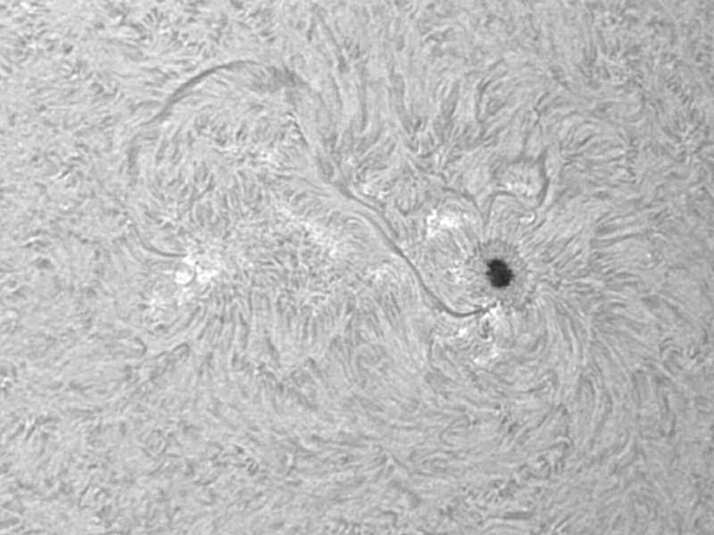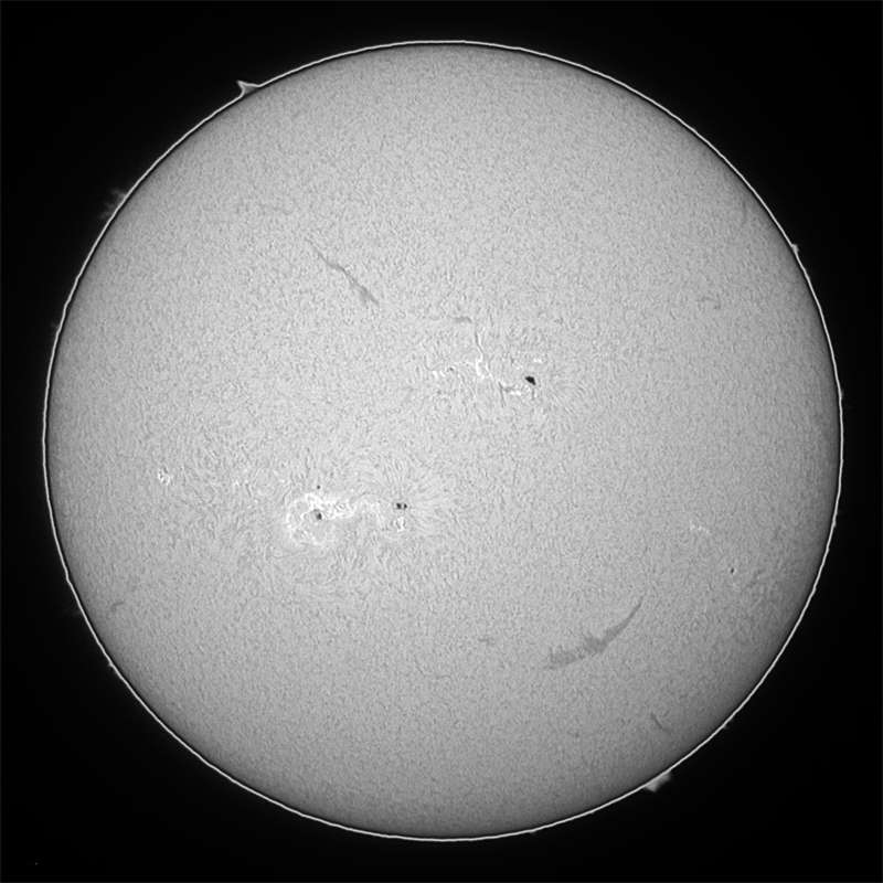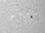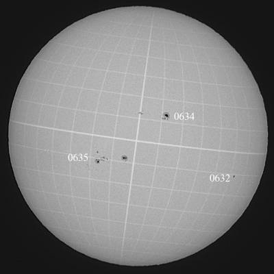 朝の一瞬の雲間に撮影出来ました。うす雲を通してなのでイマイチの画像ですが、幸いシーイングが良かったので物になりました。さて、0635群ですが、観測中に小さなフレアを起こしていました。また西のエッジには見事なプロミネンスが出現しています。22日の画像ではフィラメントとして写っていますね。結局、0635群は大人しかったですね。でも、変化がとてもゆっくりなので、最回帰してくれると嬉しいですね。それを期待しましょう。 |
